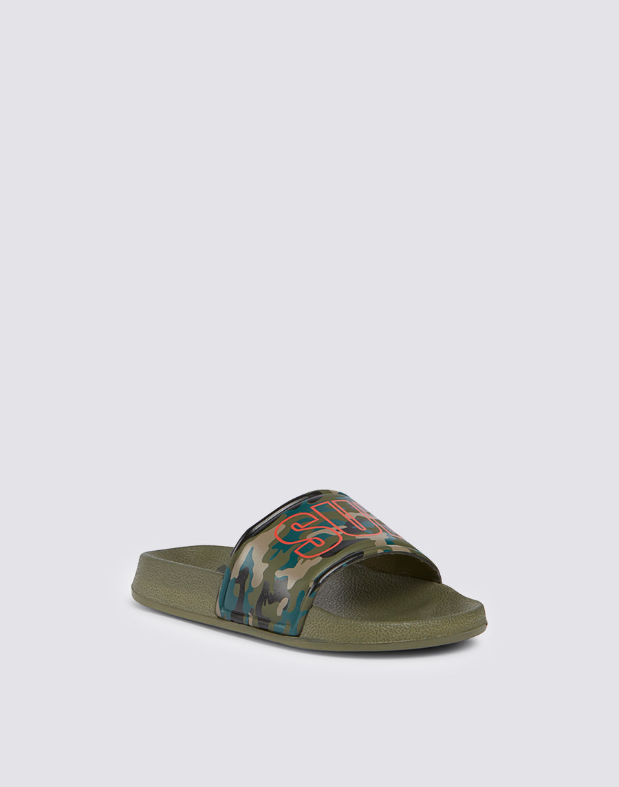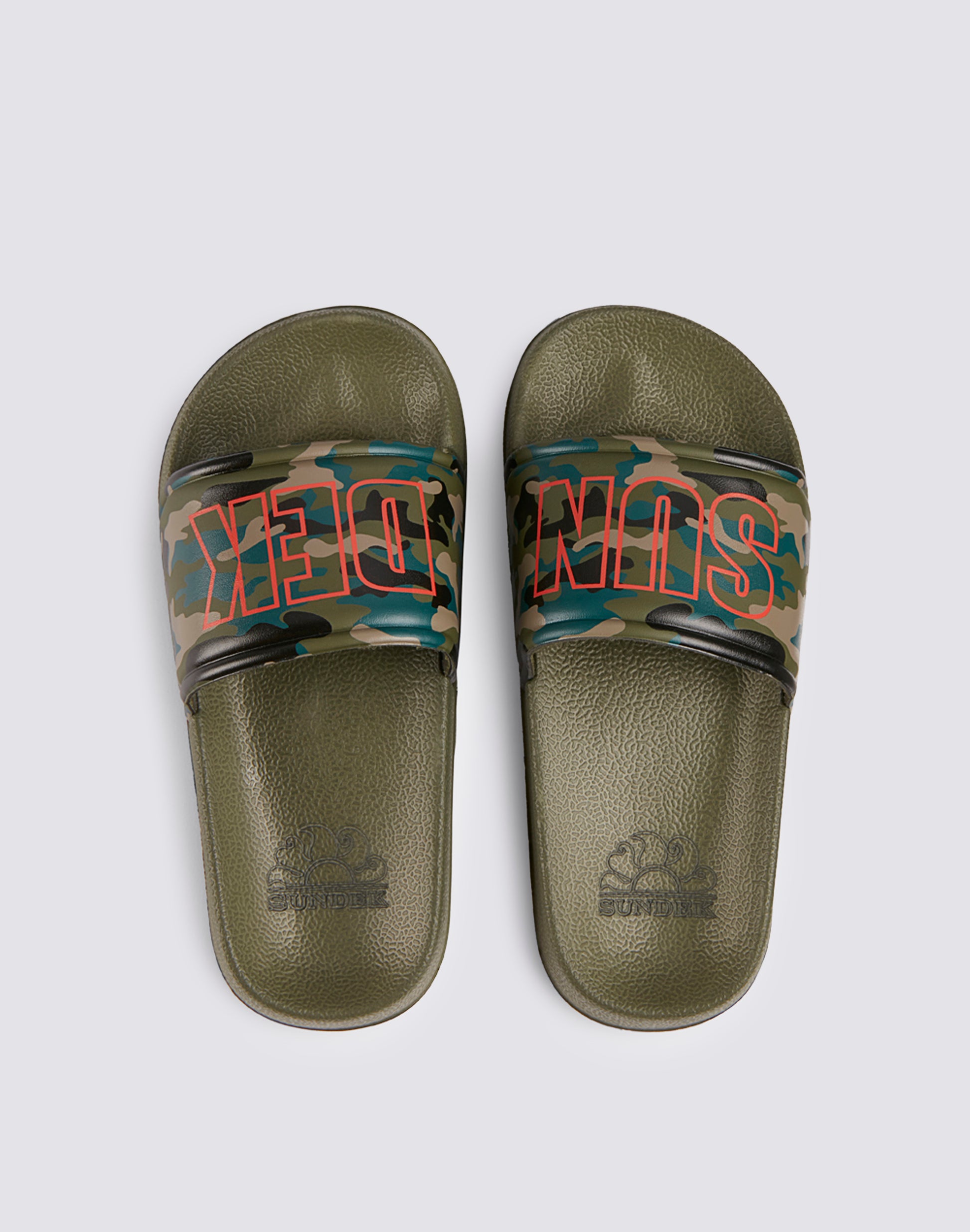 Para destacar incluso jugando en la playa o en la piscina. Estas mini chanclas son realmente originales, gracias al estampado de camuflaje acuático y al logotipo de Sundek impreso en la goma. La altura de la suela es de 2,5 cm; el ajuste es supercómodo.