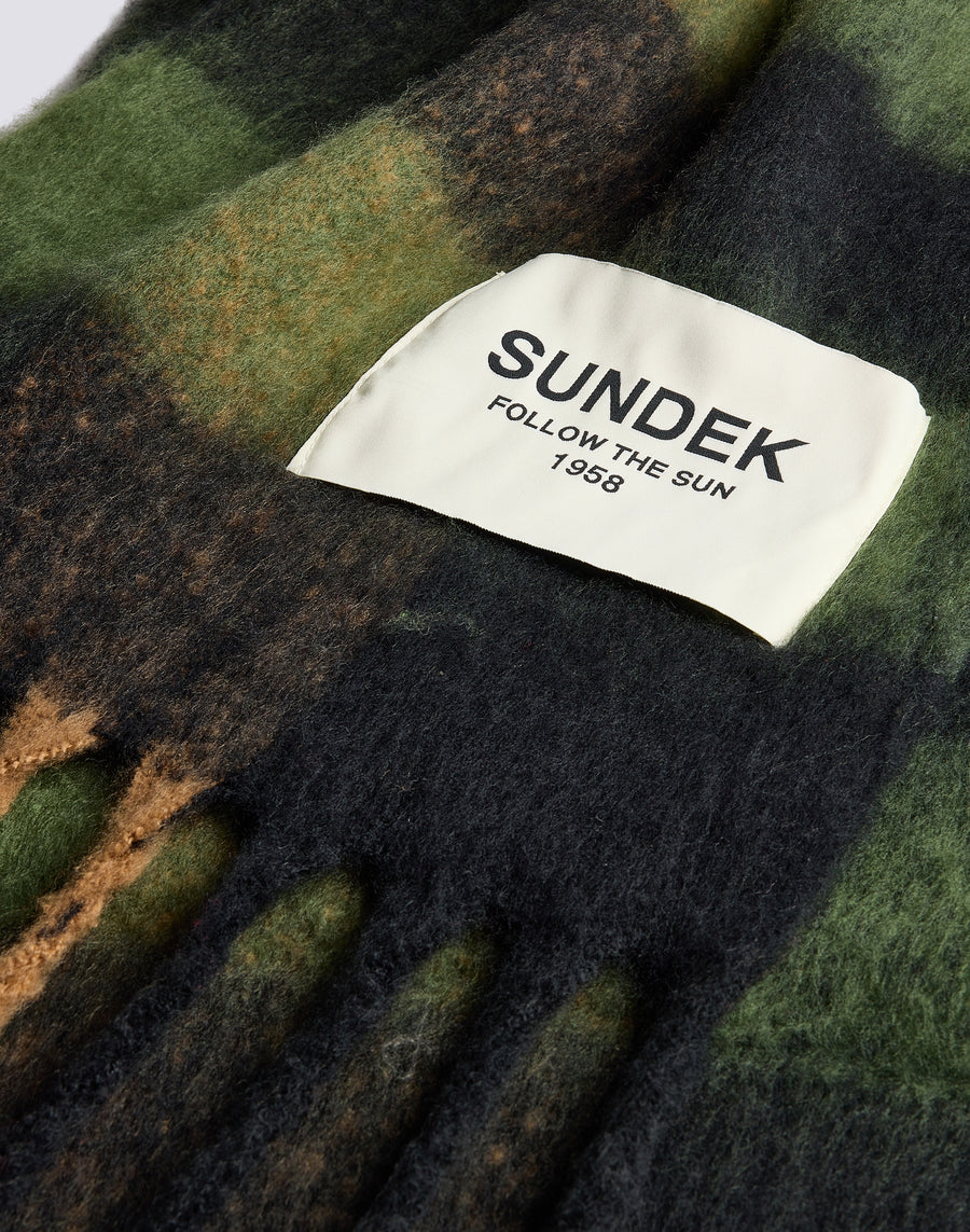 Bufanda estampada multicolor con gran etiqueta del logotipo y flecos, el accesorio imprescindible para los días de invierno.