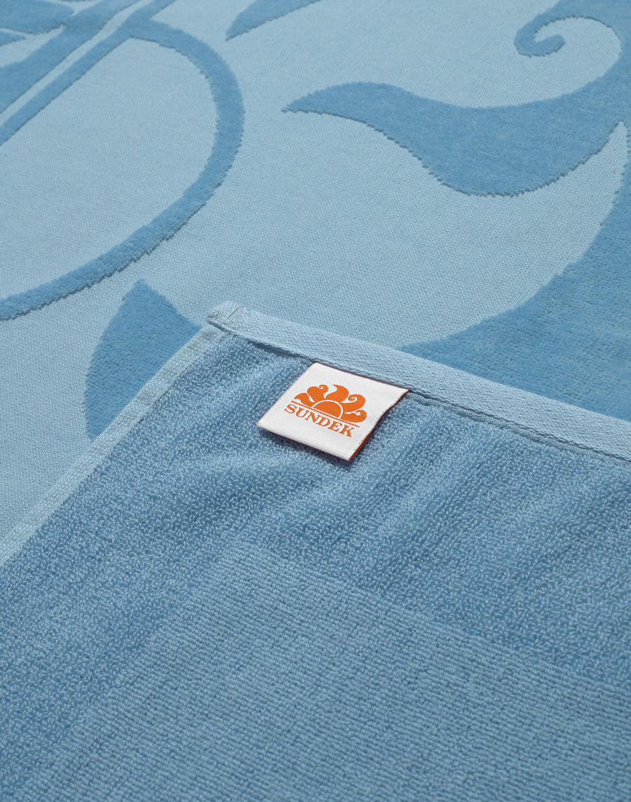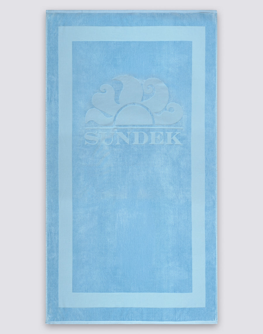 Toalla de playa de rizo jacquard con logotipo en tono y ribete, ambos en relieve.