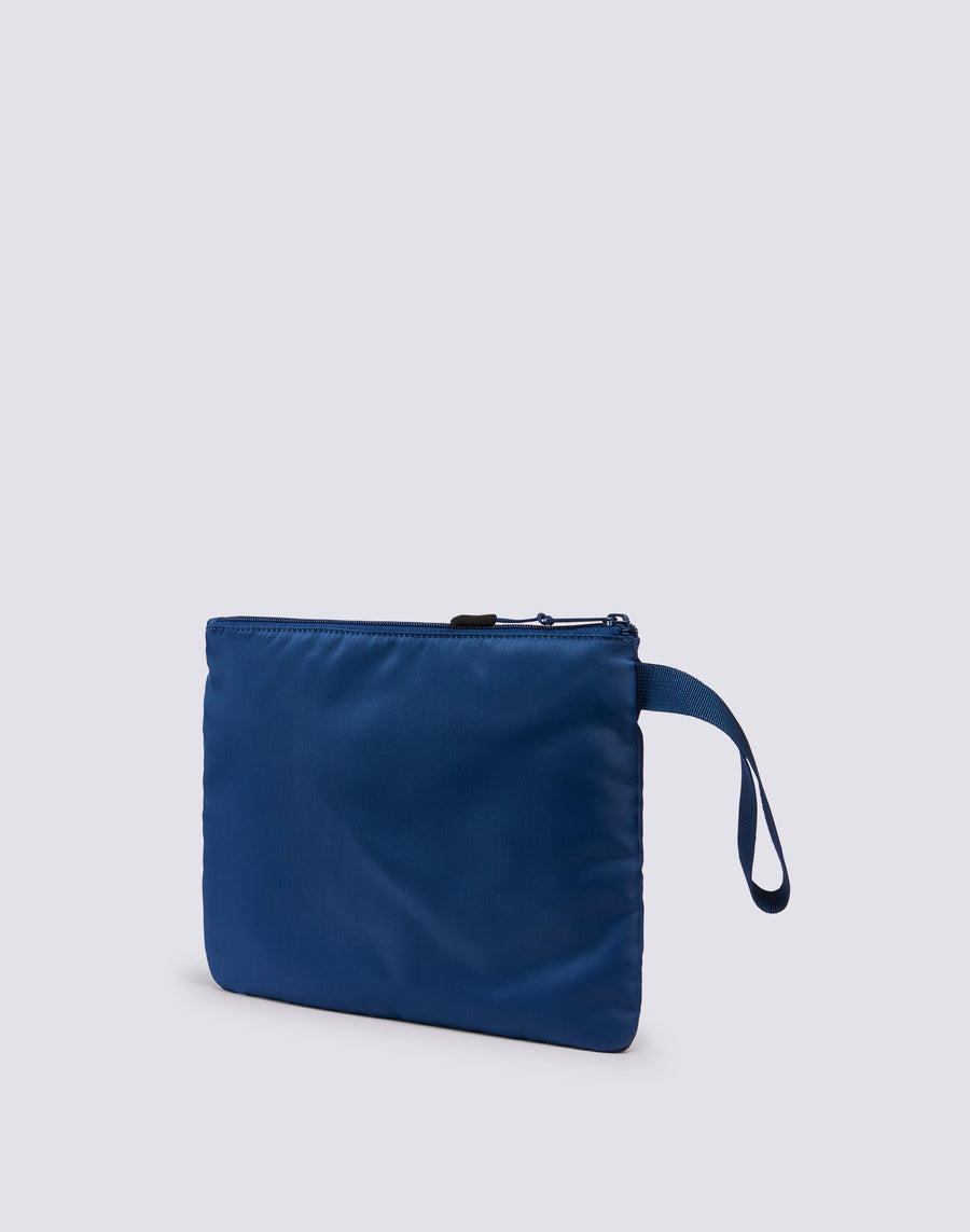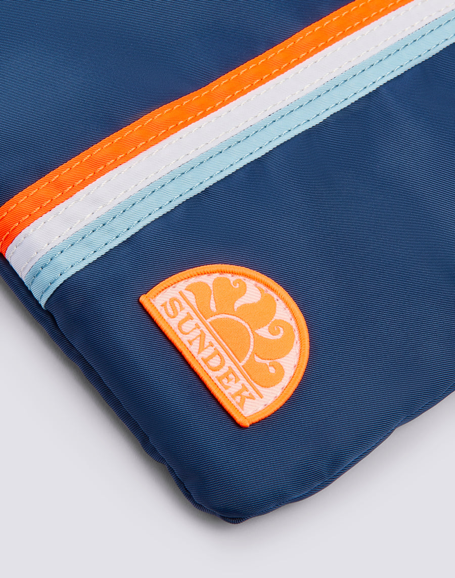 Pochette de playa ligera y forrada con el icónico detalle de las cintas tricolor para guardar y proteger los básicos que prefieres tener a mano. Perfecta para llevar en el bolso o sola gracias a la práctica correa de muñeca.