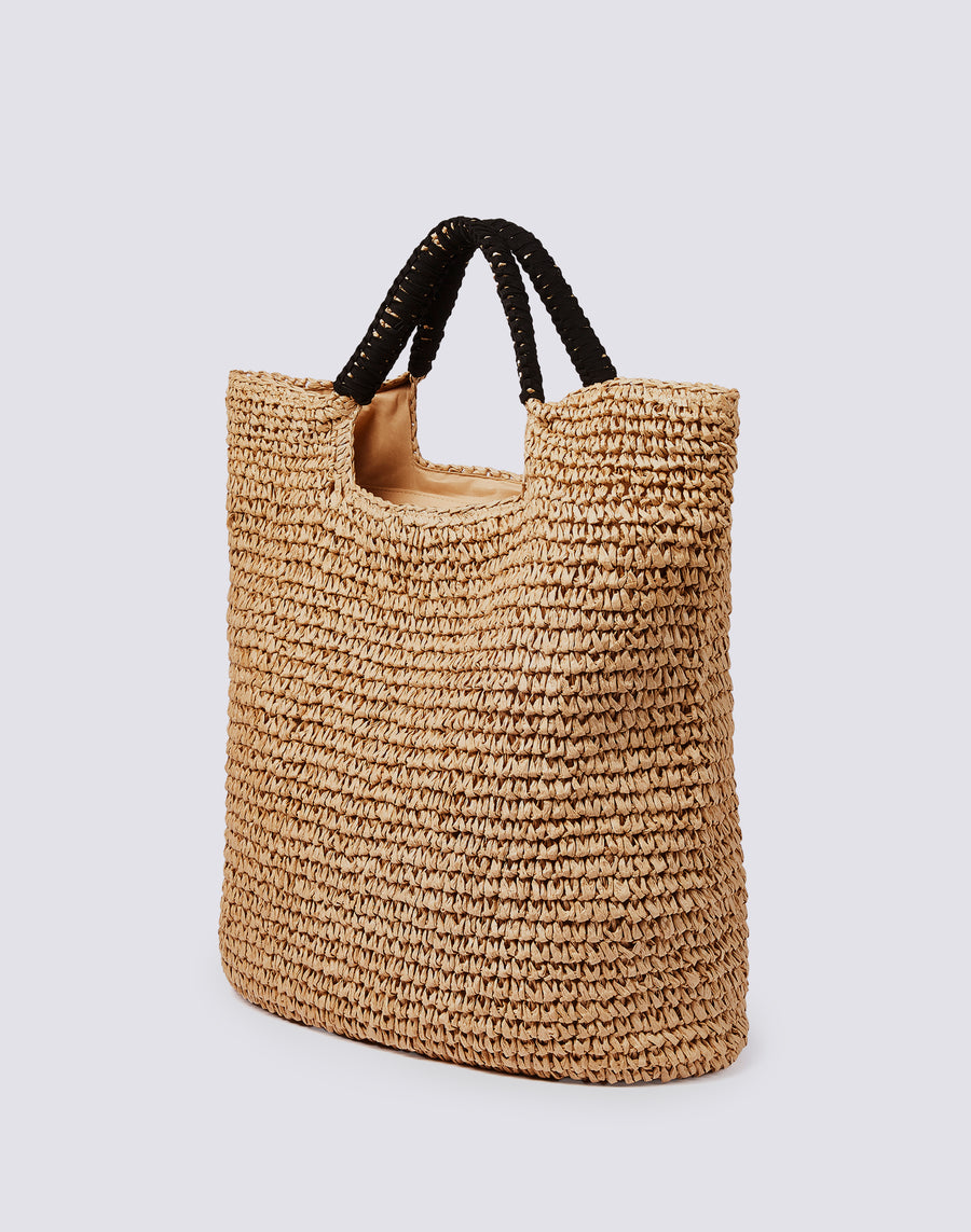 Grande y espaciosa, la bolsa de papel tramado es el accesorio de verano por definición: perfecta para la playa y para cualquier ocasión diaria, también te acompañará de manera desenfadada en la ciudad en combinación con tus outfits de verano informales.