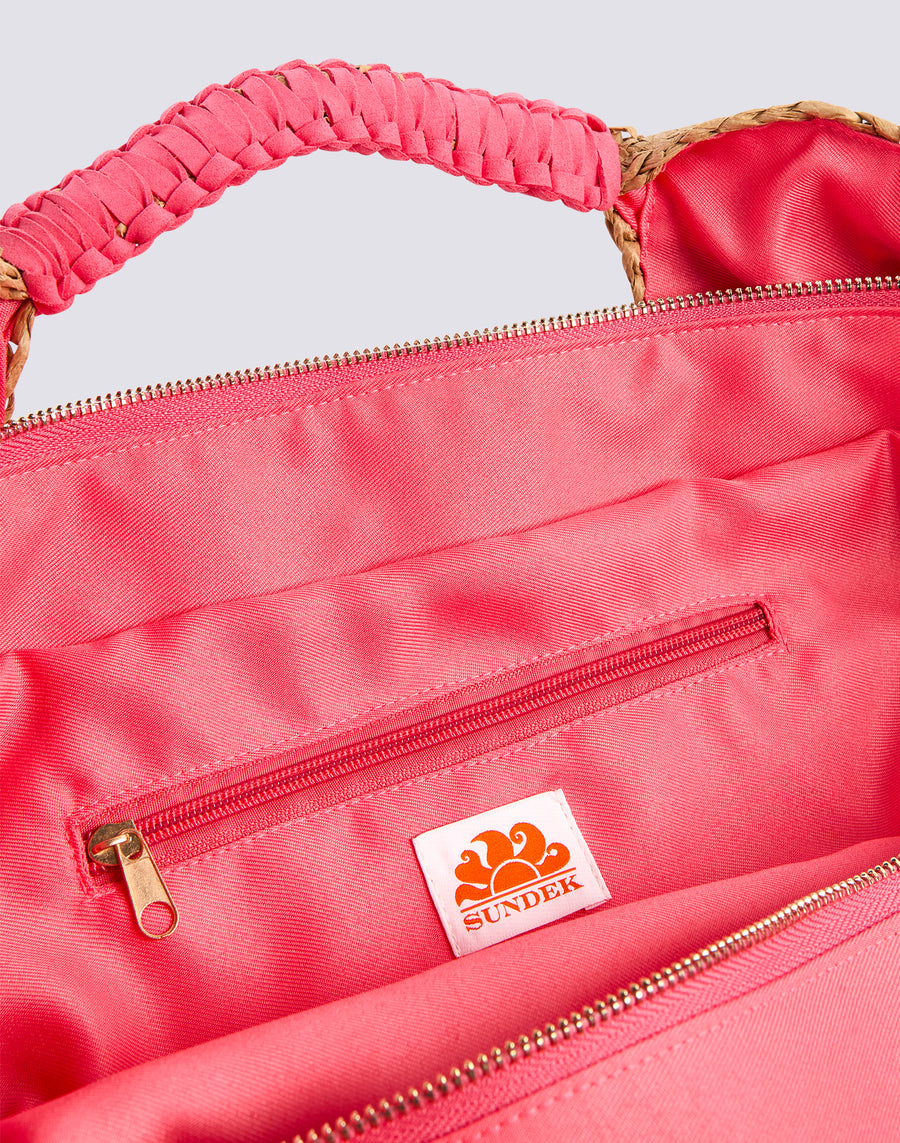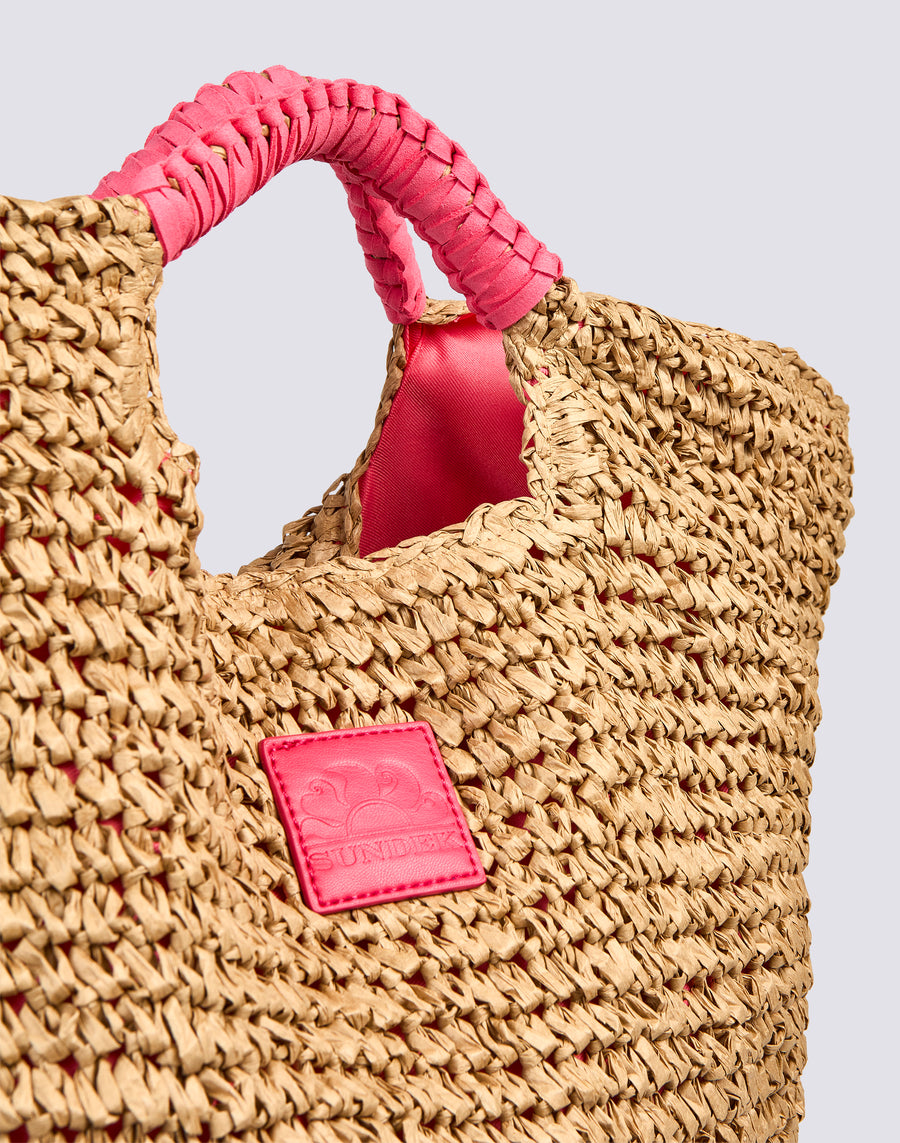 Bolsa de la compra de papel efecto paja con asas en contraste. Amplia, con cierre central de cremallera, es ideal para pasear o como bolsa de playa.