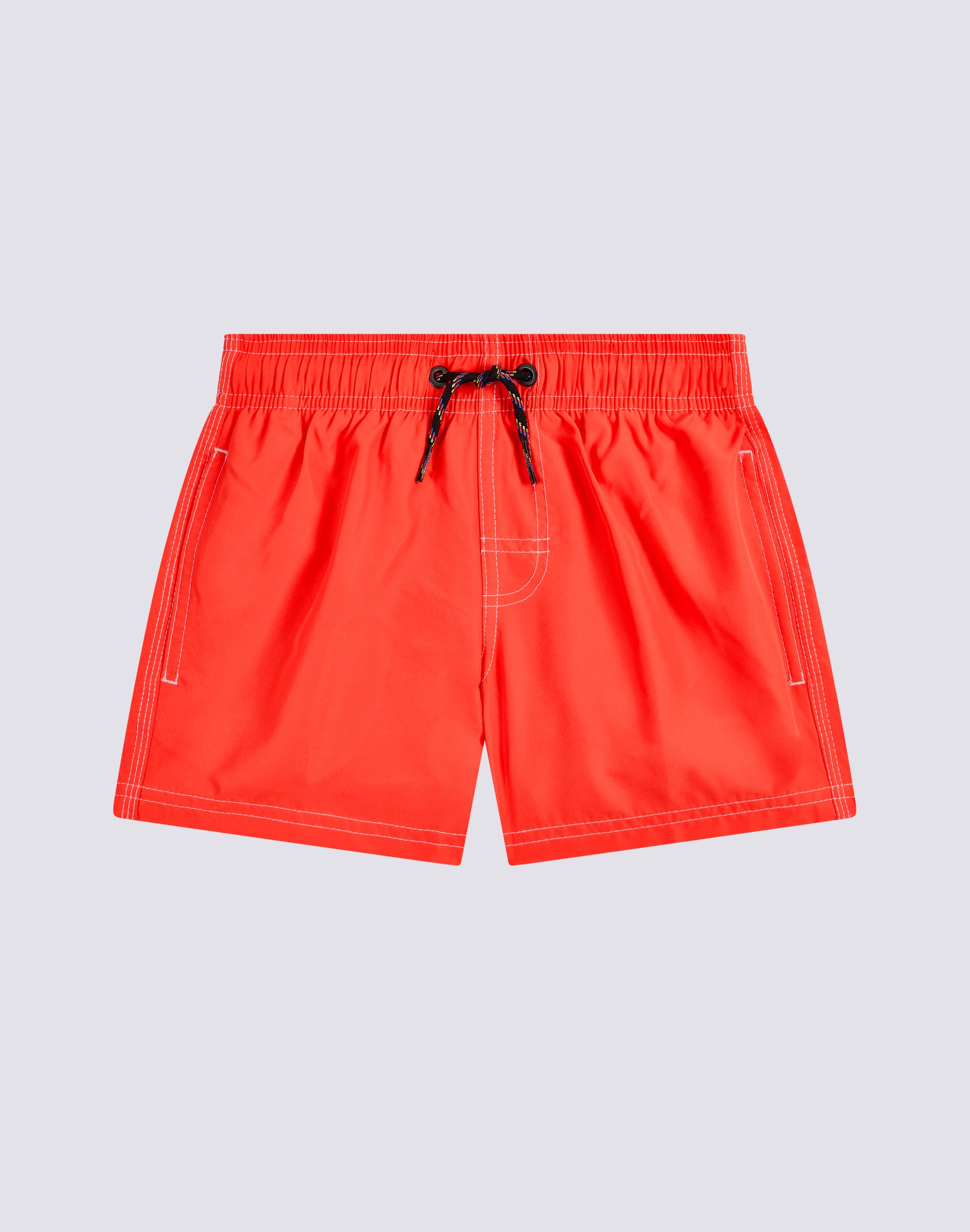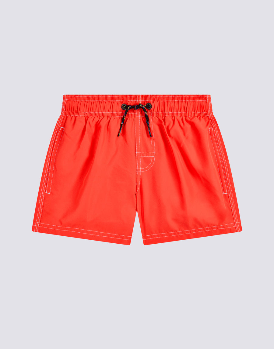 Traje de baño corto para niño en tejido reciclado Repreve® fluo, ligero y de secado rápido. Detalle del icónico arco iris Sundek en la espalda y cordón de ajuste negro. Longitud exterior del muslo 10,25/26 CM (en talla 6 años).