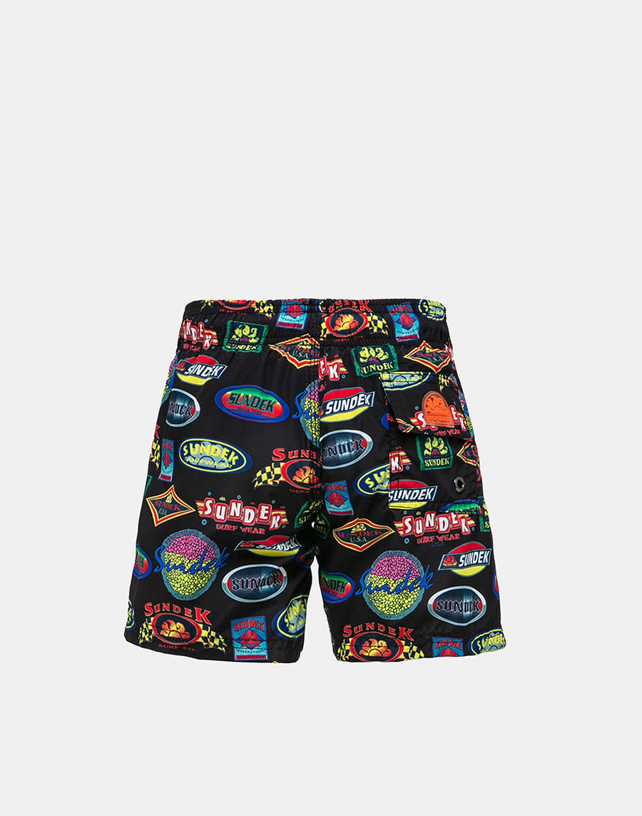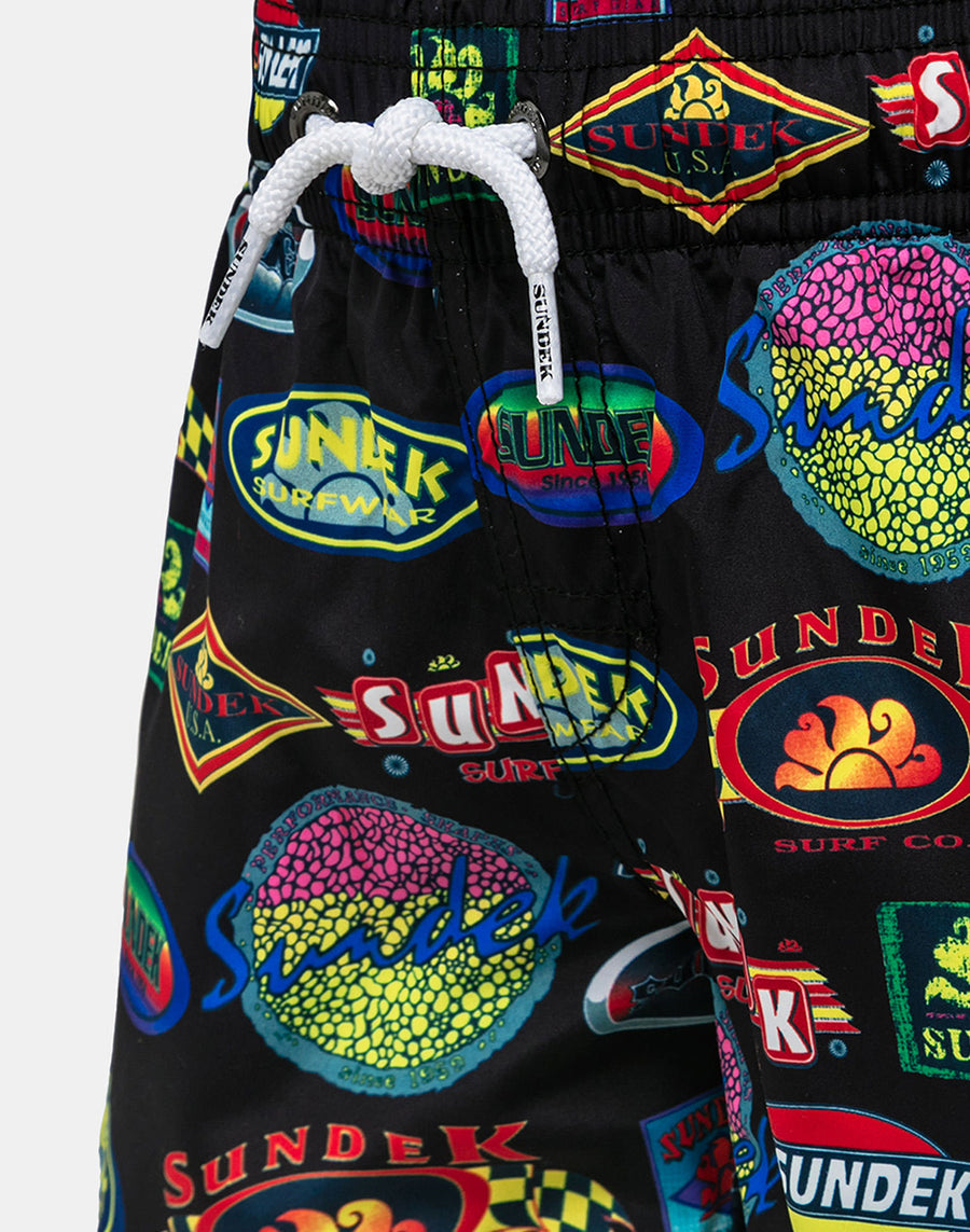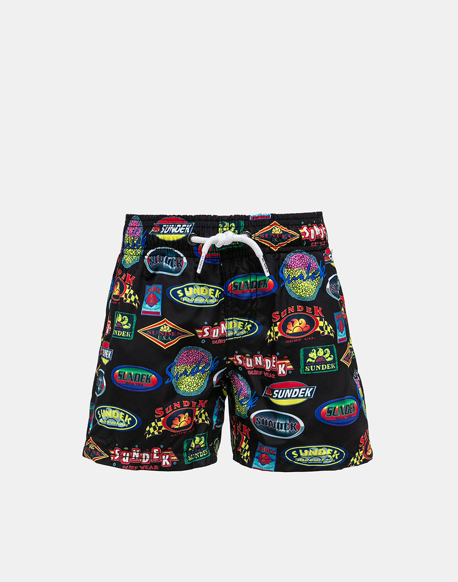 Un bañador lleno de estilo gracias al estampado de los logos históricos de Sundek que completan un modelo cómodo y fácil de llevar gracias a la cinturilla elástica con cordón. En tejido reciclado ligero, resistente y de secado muy rápido, para la comodidad de los más pequeños dinámicos que alternan el baño con el juego en la playa.