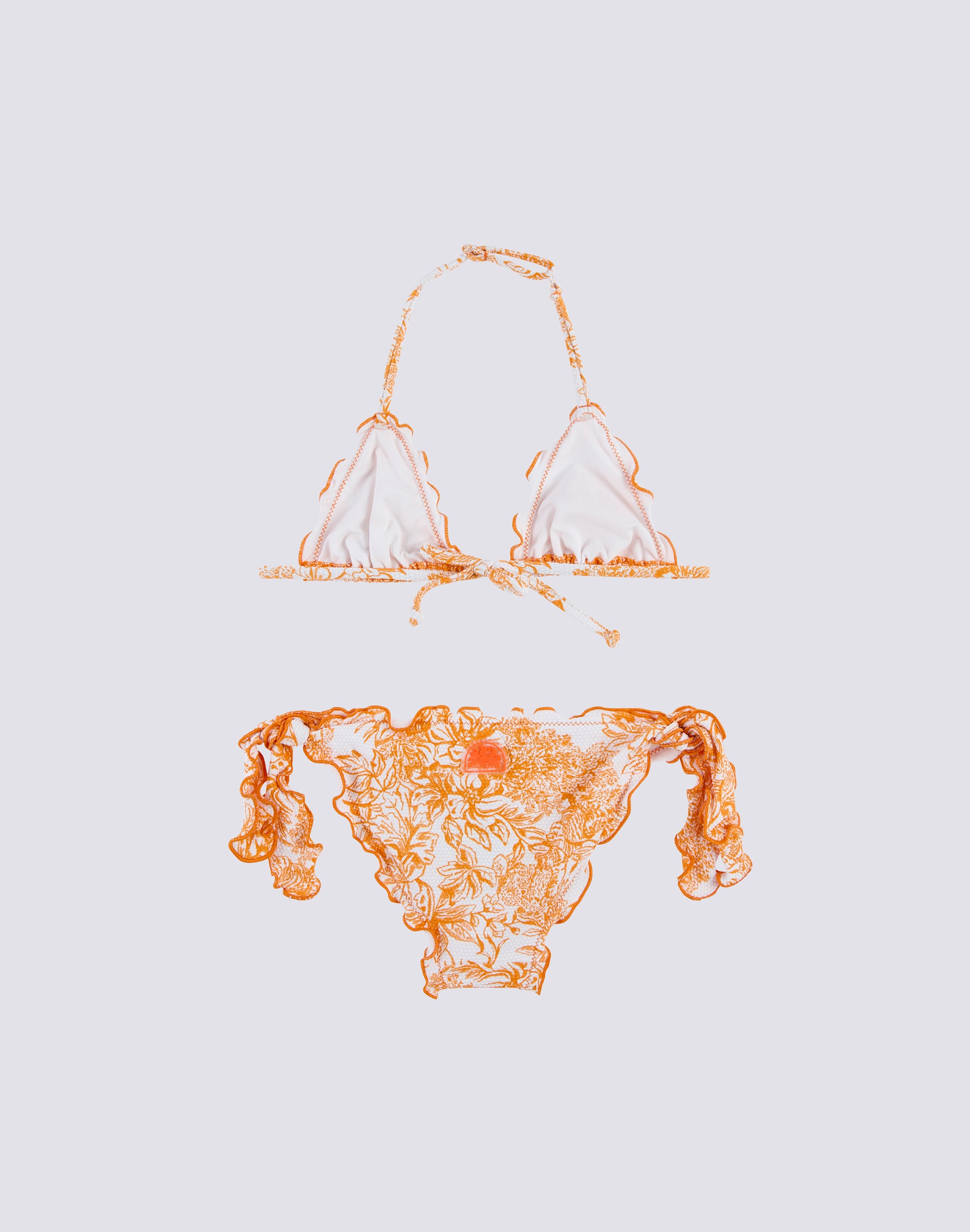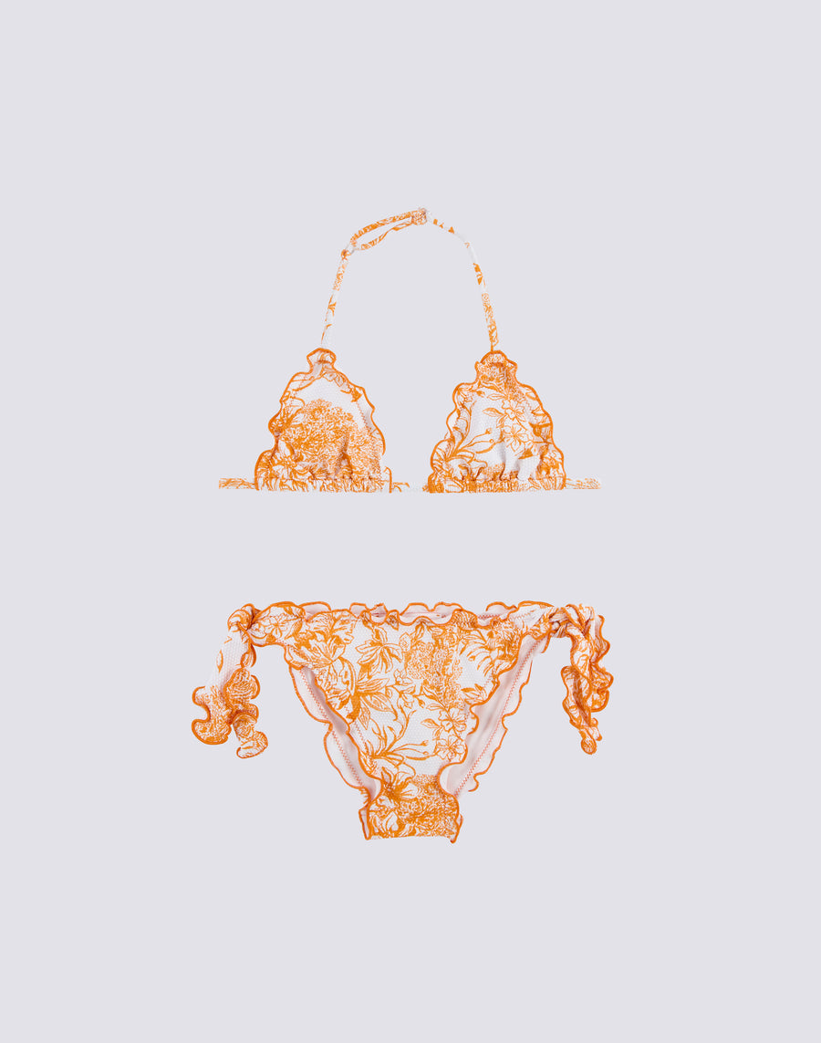 Mini bikini Magnolia compuesto por un top de triángulo ajustable con volantes y una braguita con volantes y lazos. Estampado Fleur de Joie y tejido Piquet. Modelo a juego para un look mix&match en la playa.