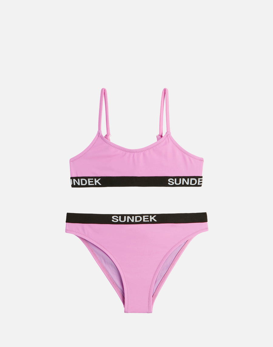 Elige este bikini para tu hija, compuesto por un top bandeau y una braguita con elástico, personalizados con el logotipo en contraste. El tejido ecosostenible, suave y resistente es apto para miles de baños y juegos en la playa.