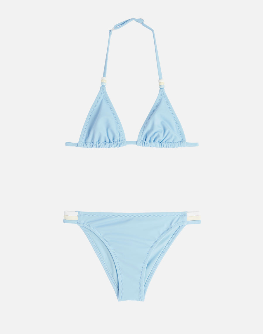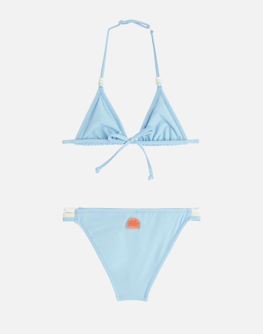 Bikini playero de niña con top triangular ajustable con cordones detrás del cuello adornado con abalorios tricolor. Los tres colores de las cuentas se reproducen en el detalle tricolor lateral de la braguita. El bañador de dos piezas está confeccionado en un cómodo y resistente tejido VITA by Carvico que no teme al cloro ni a los protectores solares.