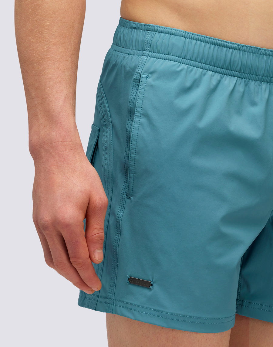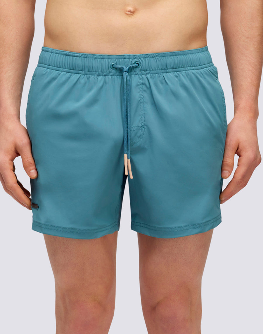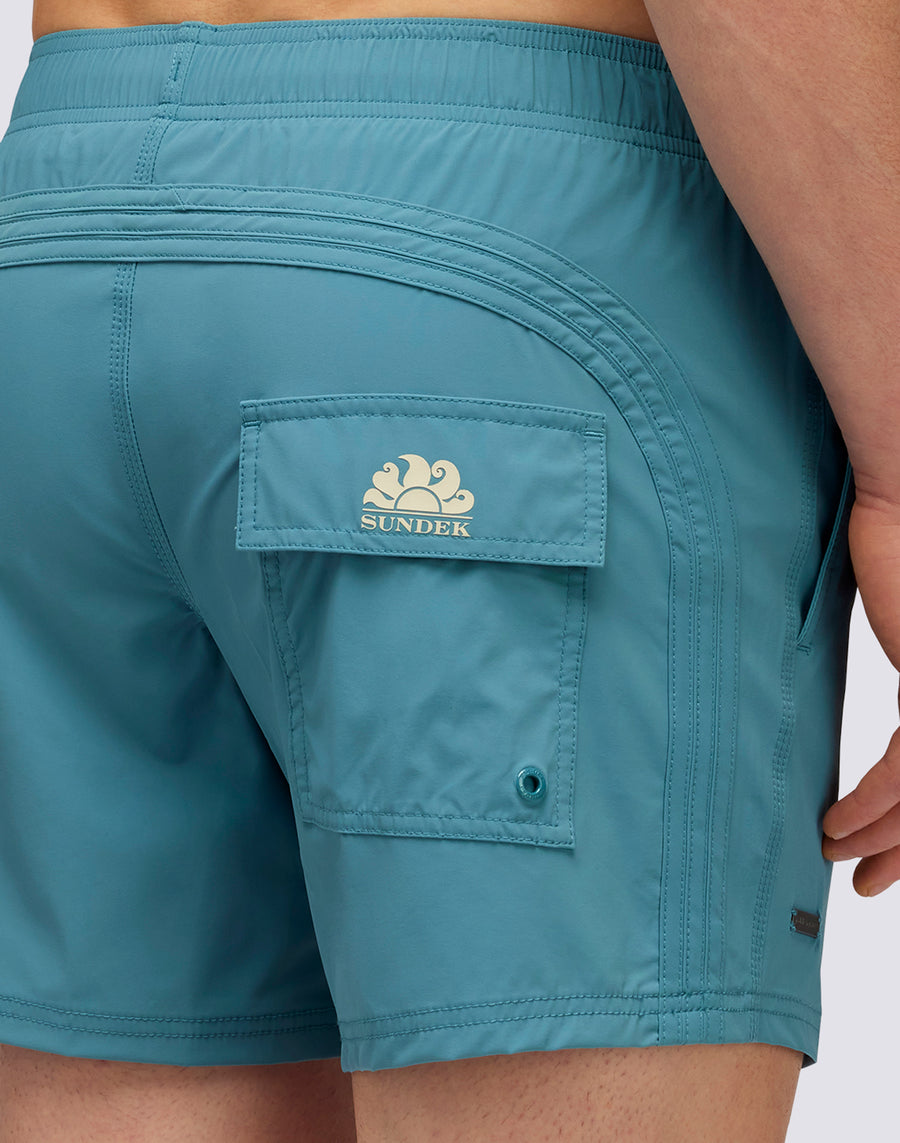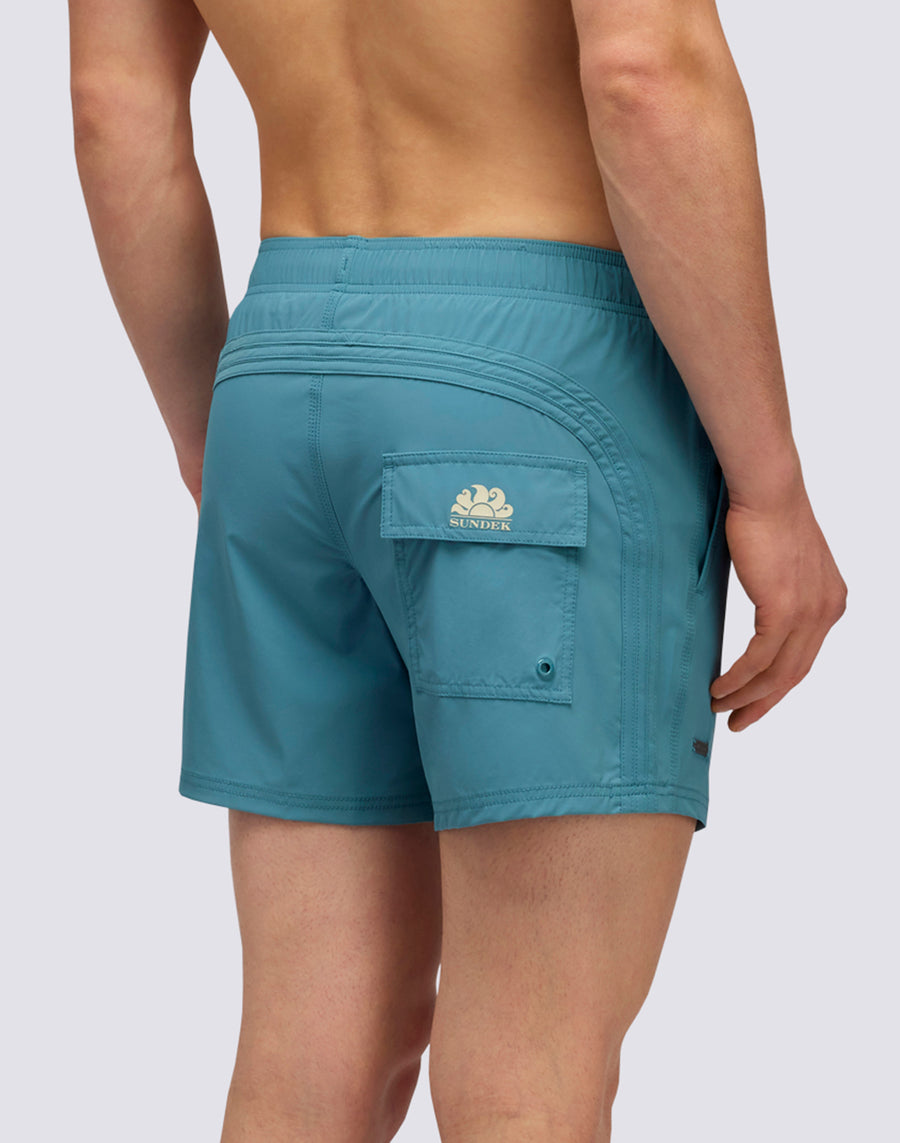Bañador GoldenWave Sundek para hombre con delicada espalda arco iris tono sobre tono, cordón de ajuste y cintura elástica. Bolsillo trasero con logotipo bordado. El modelo mide 188 cm y lleva una talla M.