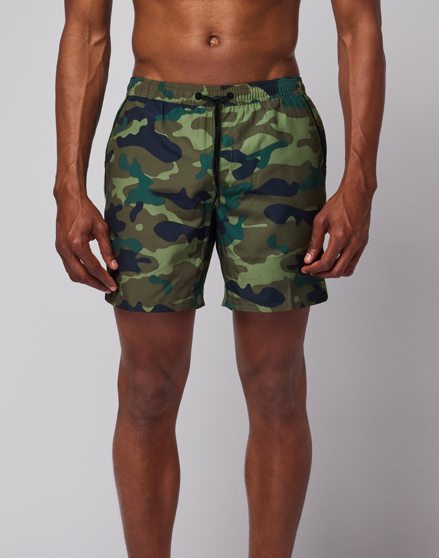 Bañador para hombre Pervis con estampado de camuflaje y cintura elástica. Con cordón y ribetes en contraste, triple costura en las zonas de mayor tensión para una mayor resistencia. Bolsillo trasero con velcro y logotipo bordado. Longitud en la parte exterior de la pierna 16"/41 cm (en talla M).