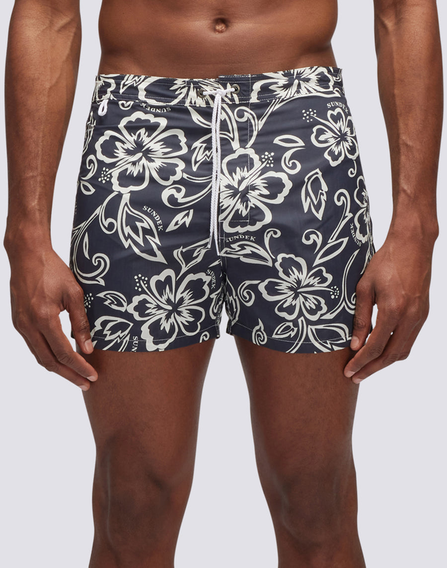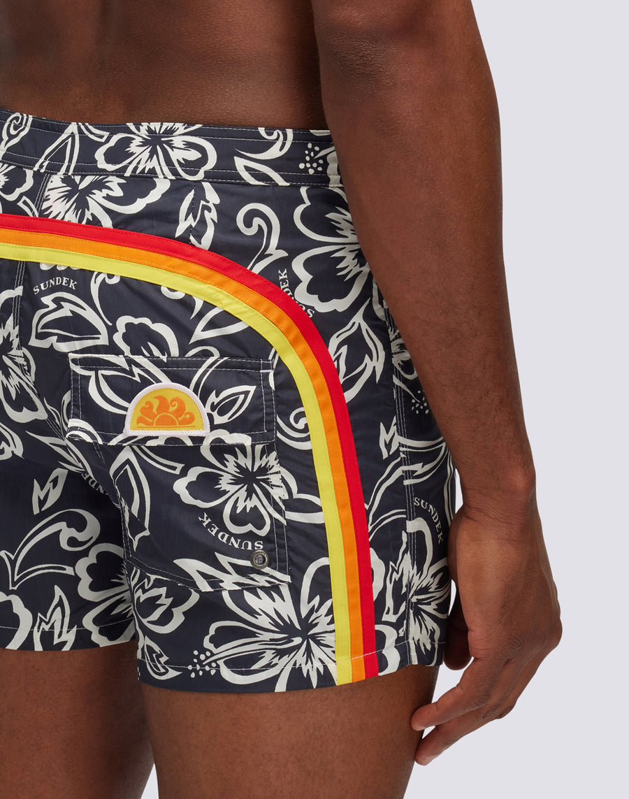 BAÑADOR CORTO ICÓNICO DE TAFETÁN Y CINTURA FIJA CON ESTAMPADO DE HIBISCOS SK23