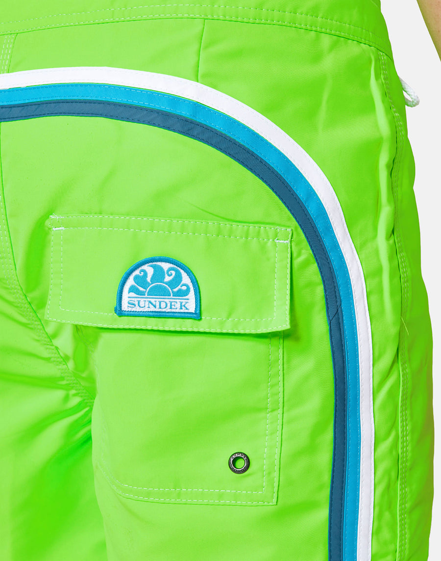 Energía vibrante, color intenso y el icónico arcoíris de Sundek que se asoma en este calzoncillo bóxer para hombre. Está confeccionado en nuestro histórico tejido de tafetán de nailon, con un tacto sedoso, cómodo y de secado rápido, mientras que el pespunte a tres agujas lo hace resistente día tras día. Longitud 35 cm (tamaño M), medido en el lado externo de la pierna.
