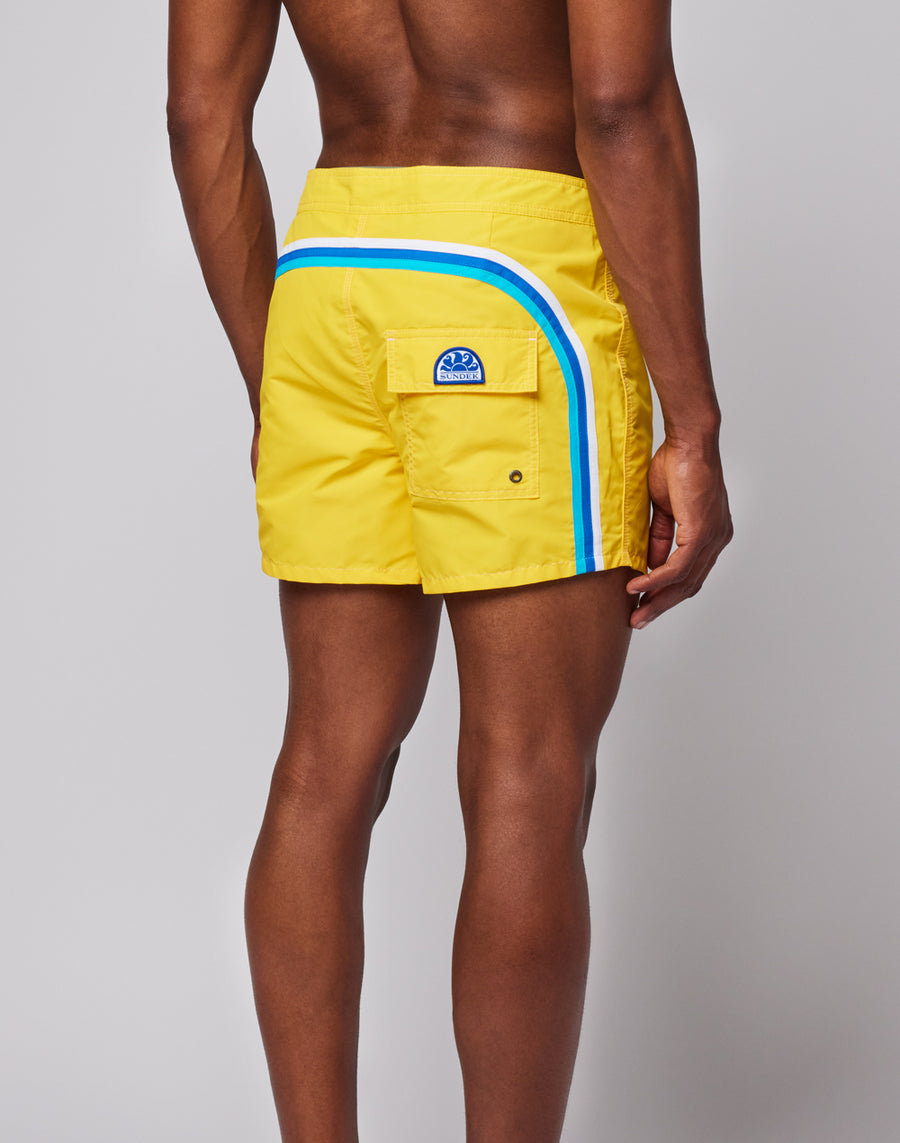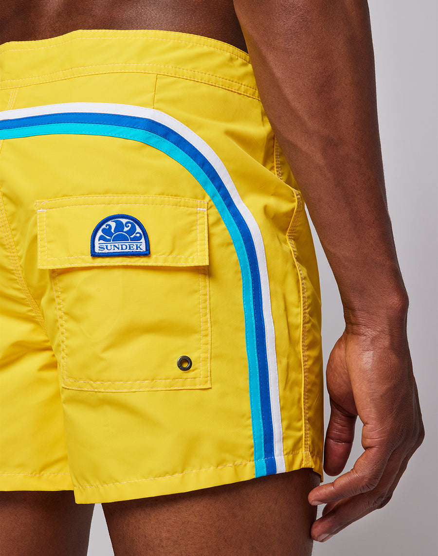 Energía vibrante, color intenso y el icónico arcoíris de Sundek que se asoma en este calzoncillo bóxer para hombre. Está confeccionado en nuestro histórico tejido de tafetán de nailon, con un tacto sedoso, cómodo y de secado rápido, mientras que el pespunte a tres agujas lo hace resistente día tras día. Longitud 35 cm (tamaño M), medido en el lado externo de la pierna.