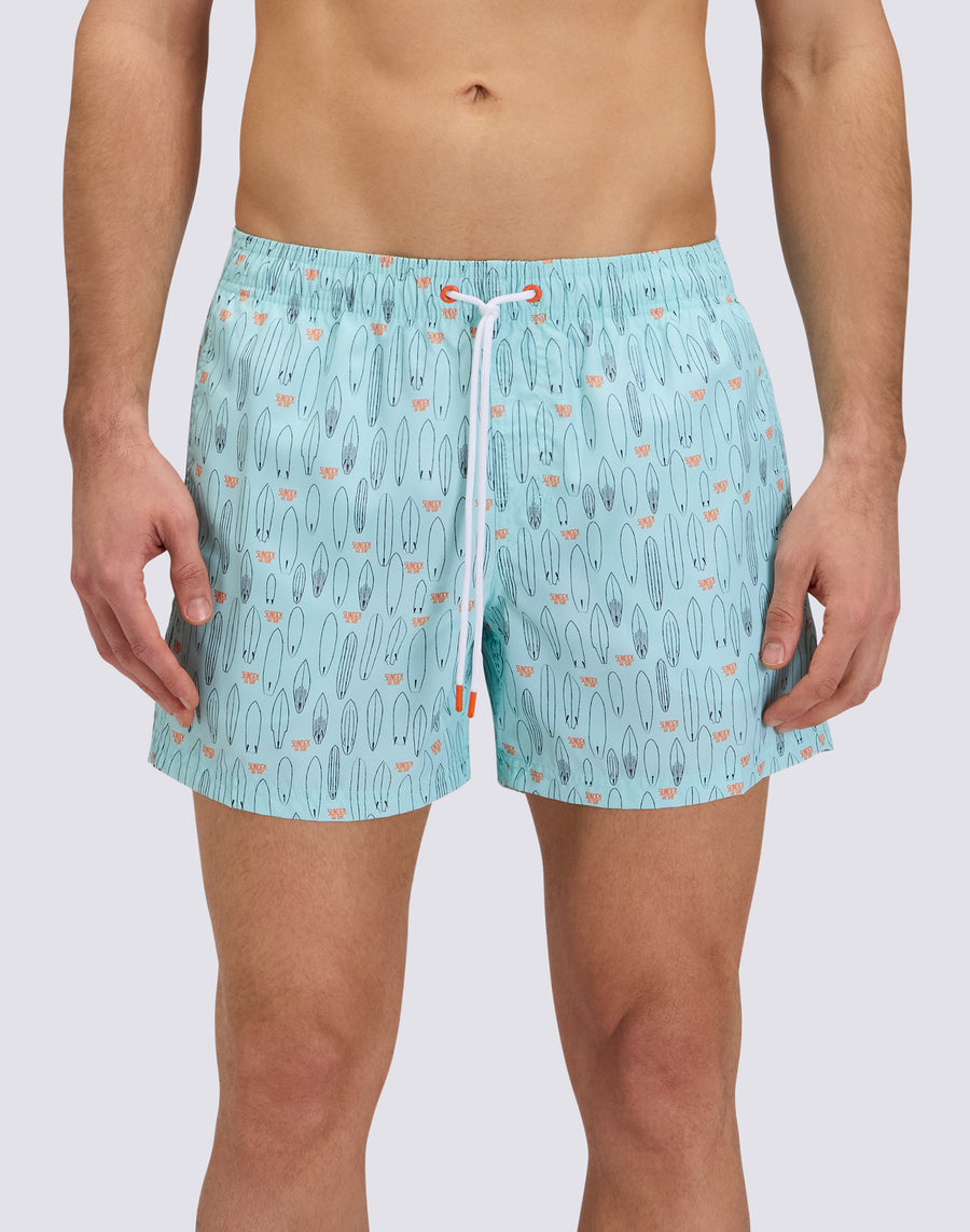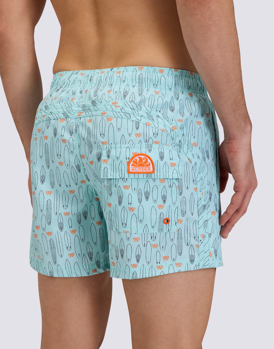 Bañador con cintura elástica con cordón, de tejido ligero Repreve® reciclado a partir de botellas de plástico. Estampado icónico SK23 y el tradicional arco iris Sundek en la espalda. Ancho exterior del muslo: 35 cm (talla m). También a juego con las braguitas del mismo estampado.