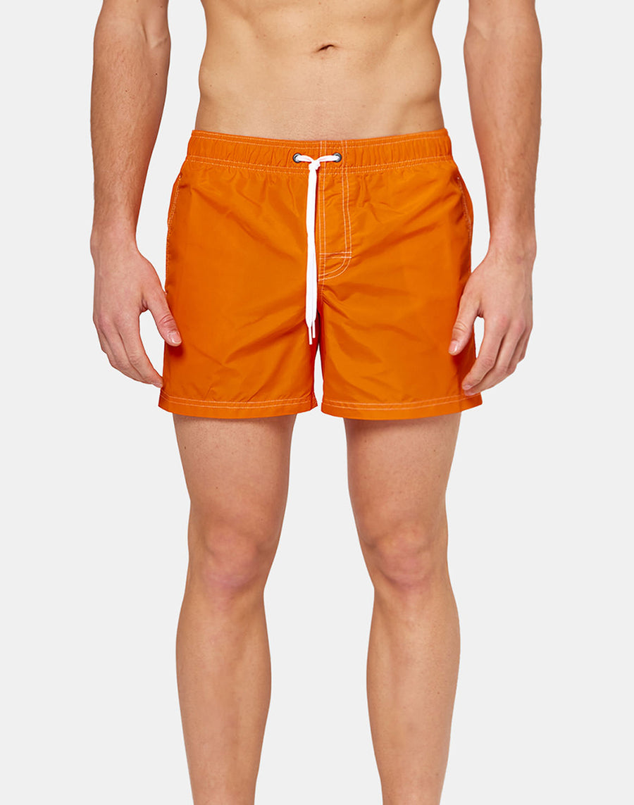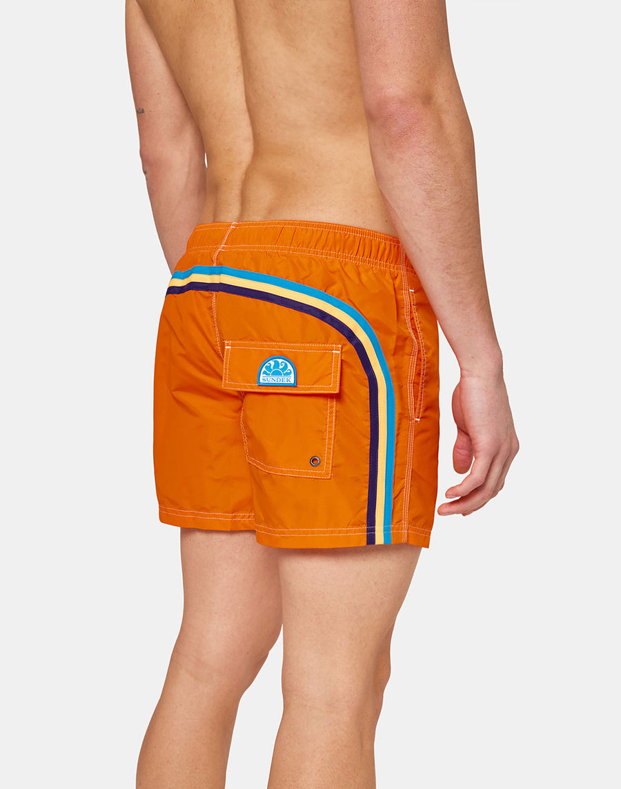 Pantalones cortos de playa para hombre con cintura elástica, cordón y el icónico arcoíris de Sundek en la espalda. Este traje de baño está hecho con costuras de tres agujas y 100% con nuestro tejido histórico, nylon-tafetán: tan suave como la seda, ligero y resistente a todo, se seca muy rápido para brindarte comodidad en todas partes, en las olas y fuera del agua.