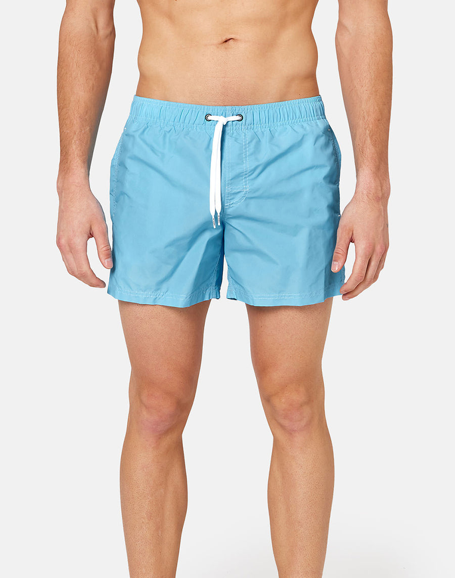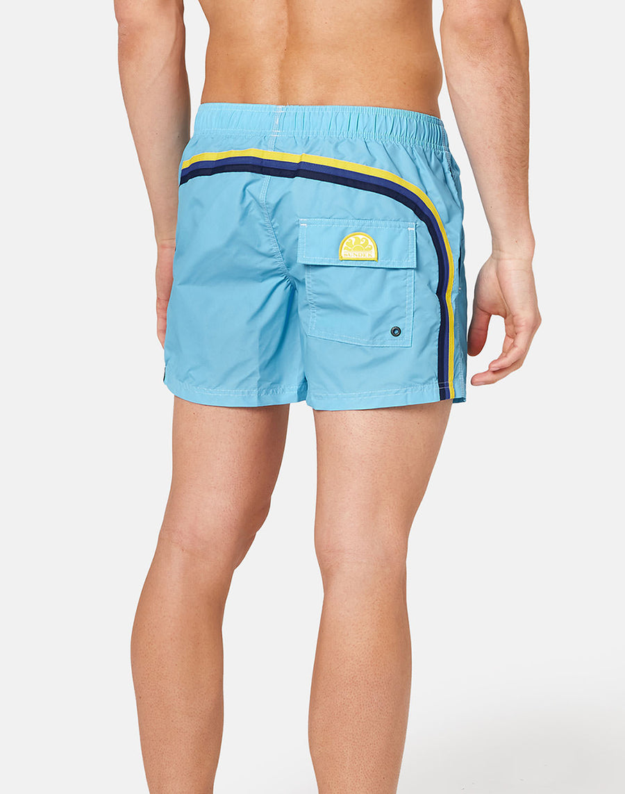 Pantalones cortos de playa para hombre con cintura elástica, cordón y el icónico arcoíris de Sundek en la espalda. Este traje de baño está hecho con costuras de tres agujas y 100% con nuestro tejido histórico, nylon-tafetán: tan suave como la seda, ligero y resistente a todo, se seca muy rápido para brindarte comodidad en todas partes, en las olas y fuera del agua.