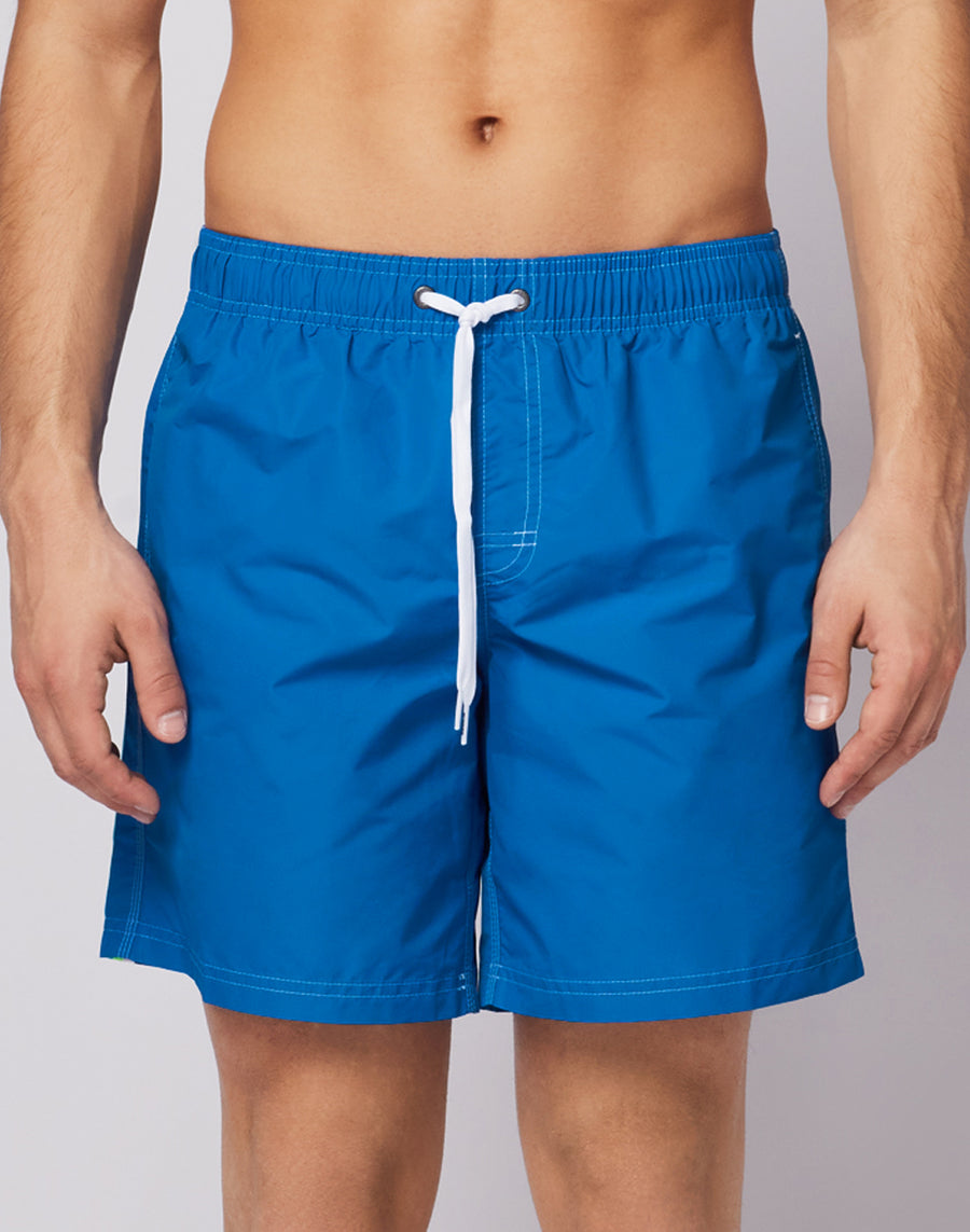 Todo el estilo Sundek atemporal en este bañador de longitud media con cintura elástica. Elegante, cómodo, construido para durar vacaciones tras vacaciones: es nuestro clásico bañador con cordón en la cintura y un arcoíris contrastante en la espalda, confeccionado en nuestra tradicional tela de tafetán de nailon que es liviana y de secado rápido, duradera, con costuras de tres agujas para un refuerzo más.