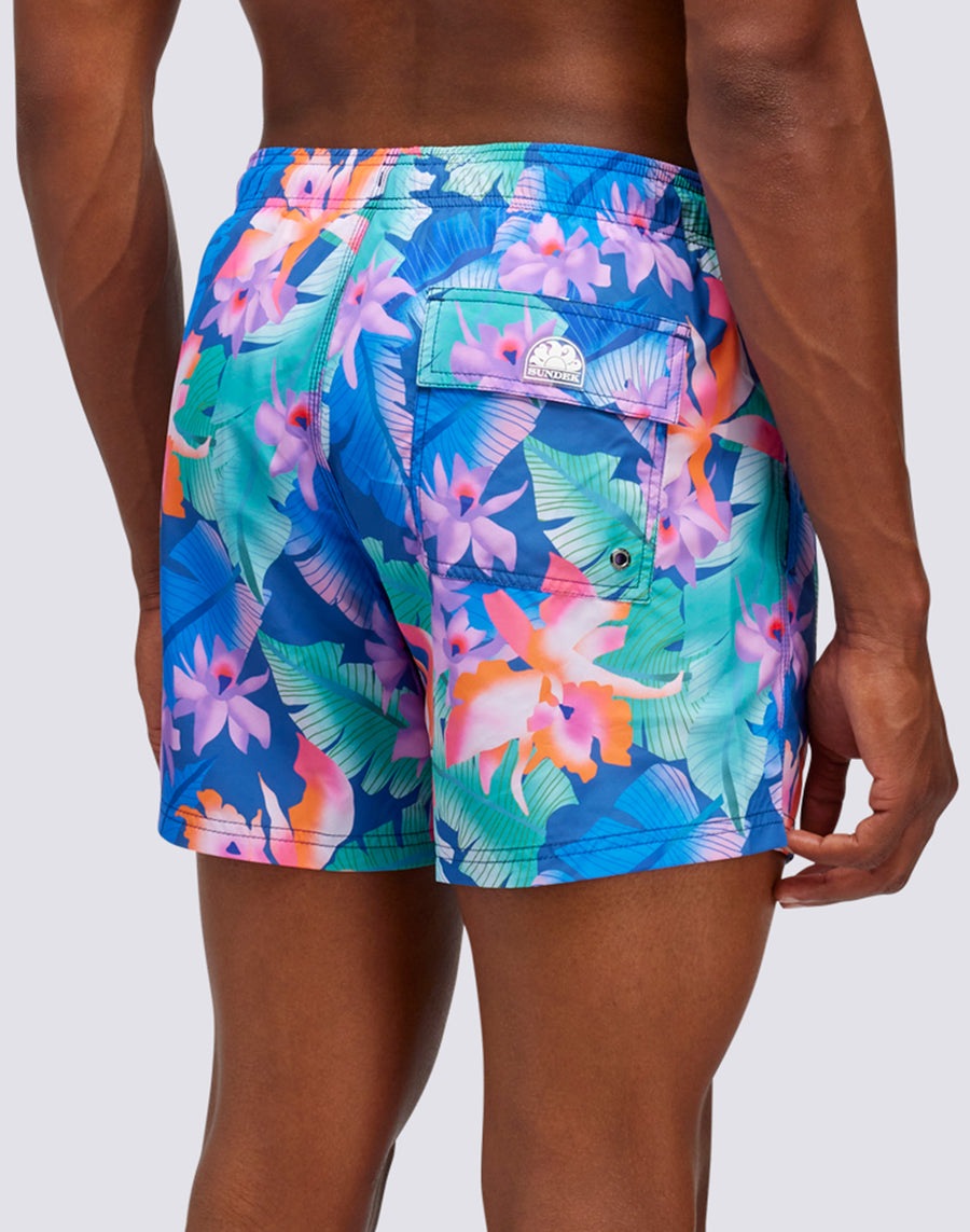 TRAJE DE BAÑO CORTO CON ESTAMPADO DE ORQUÍDEAS RECICLADO Y CINTURA ELÁSTICA
