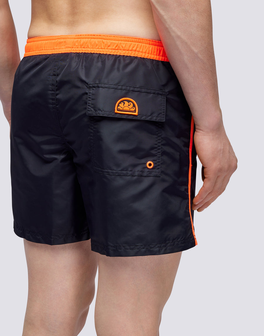 ICÓNICO BAÑADOR CORTO DE TAFETÁN CON CINTURA ELÁSTICA Y RIBETES EN CONTRASTE