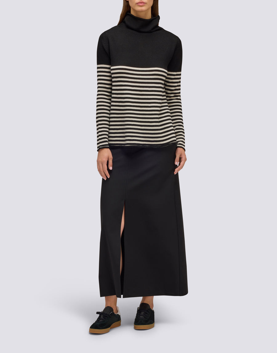 Esta falda larga de sarga de poliéster y viscosa combina estilo y comodidad con una cintura semielástica que garantiza un ajuste perfecto. El diseño con abertura frontal añade un toque de elegancia y feminidad, ideal para realzar cualquier look con movimiento y sofisticación.