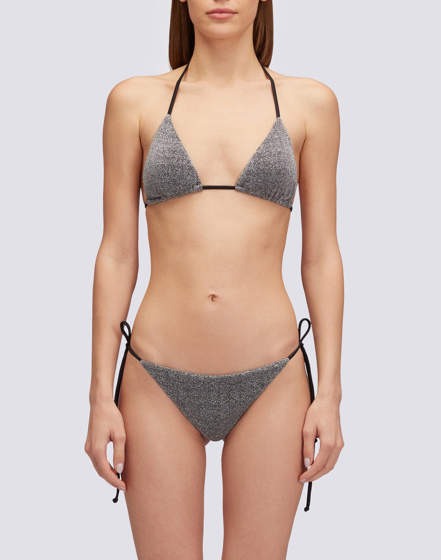 64% POLYESTER 36% ELASTANE Shiny lurex fabric, comfortable and with lining that guarantees a soft contact with the skin.