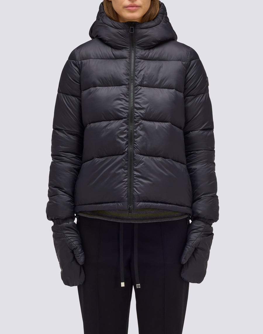 Chaqueta corta de plumón para mujer con capucha, confeccionada en tejido de nailon opaco superligero. La prenda está acolchada con amplios canales horizontales y rellena con una innovadora fibra sintética Repreve, que contribuye a conferirle ligereza y, al mismo tiempo, protección contra el frío. La chaqueta cuenta con una cremallera moldeada a presión a tono que cierra la parte delantera, mientras que los bolsillos tienen cremalleras invisibles. La capucha y el bajo de la prenda son ajustables con cordón y bloqueador. Los guantes desmontables están forrados de forro polar y completan la prenda. Corte trapecio, que realza la figura; grado de calor medio/alto.