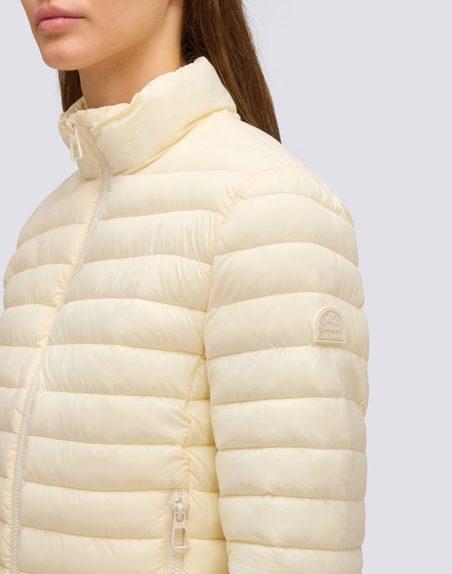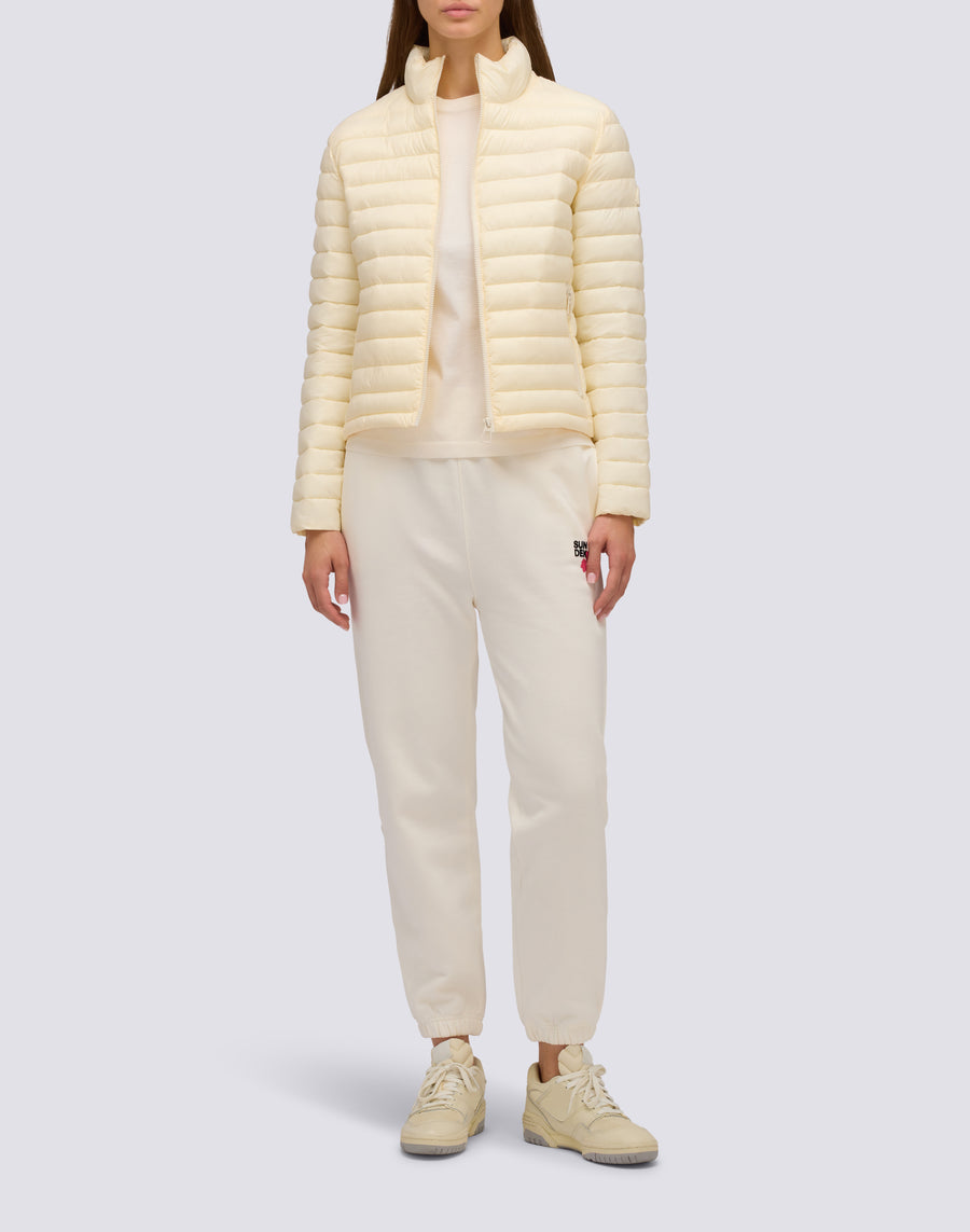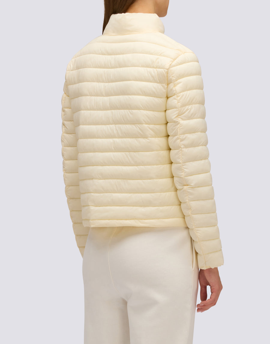 Chaqueta corta de plumón para mujer con cuello alto, confeccionada en tejido de nailon mate superligero y acolchada con canales horizontales. El relleno está fabricado con una innovadora fibra sintética Repreve, que aporta ligereza y protección contra el frío. La prenda se completa con un embalaje de nailon con el logotipo y cordón ajustable. Corte regular y grado de calor medio.