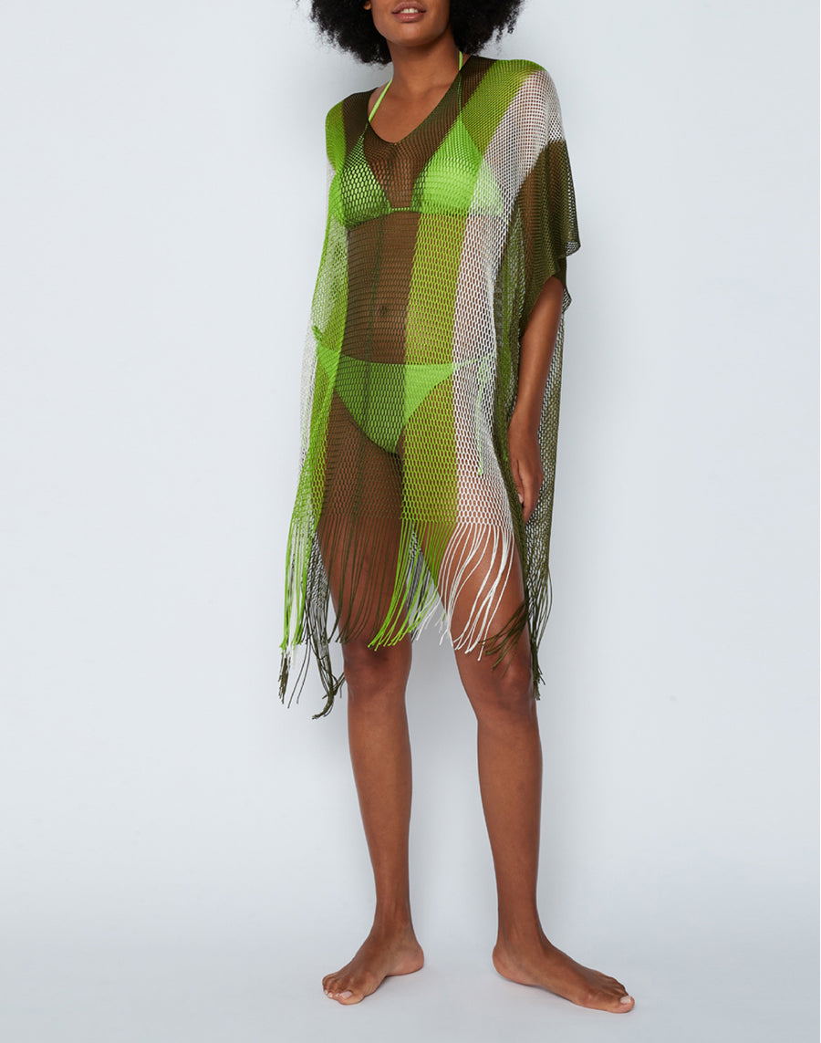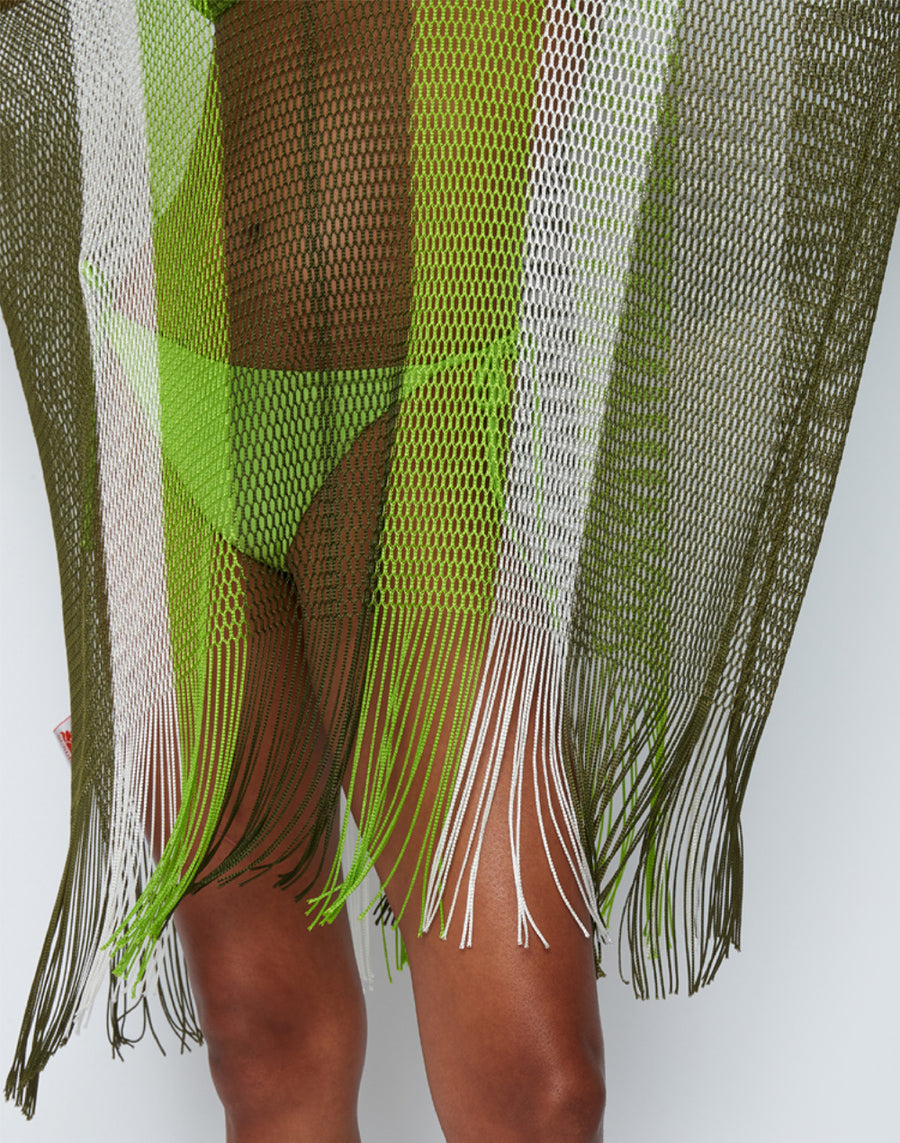 Kaftano coloreado con franjas y V. El escote cae suave por encima del bikini y da un toque de elegancia al aspecto de la playa.