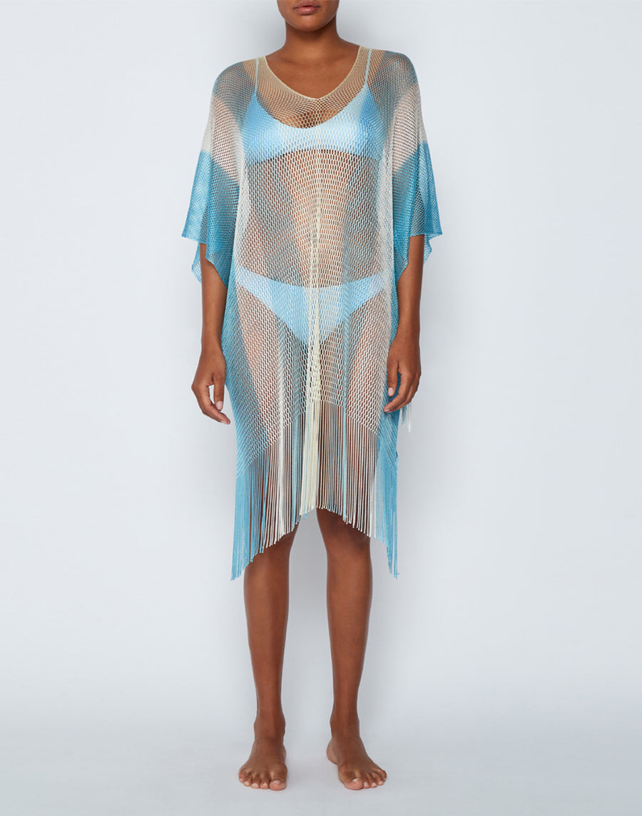 Kaftano coloreado con franjas y V. El escote cae suave por encima del bikini y da un toque de elegancia al aspecto de la playa.