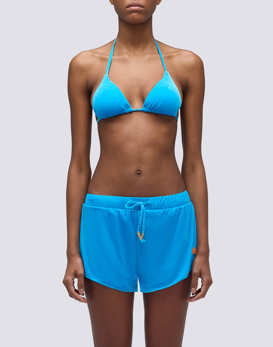 Braguita Kerr efecto terciopelo con lazos laterales fijos y adornos metálicos dorados. Elegante y brillante, para hacerte brillar en la playa.