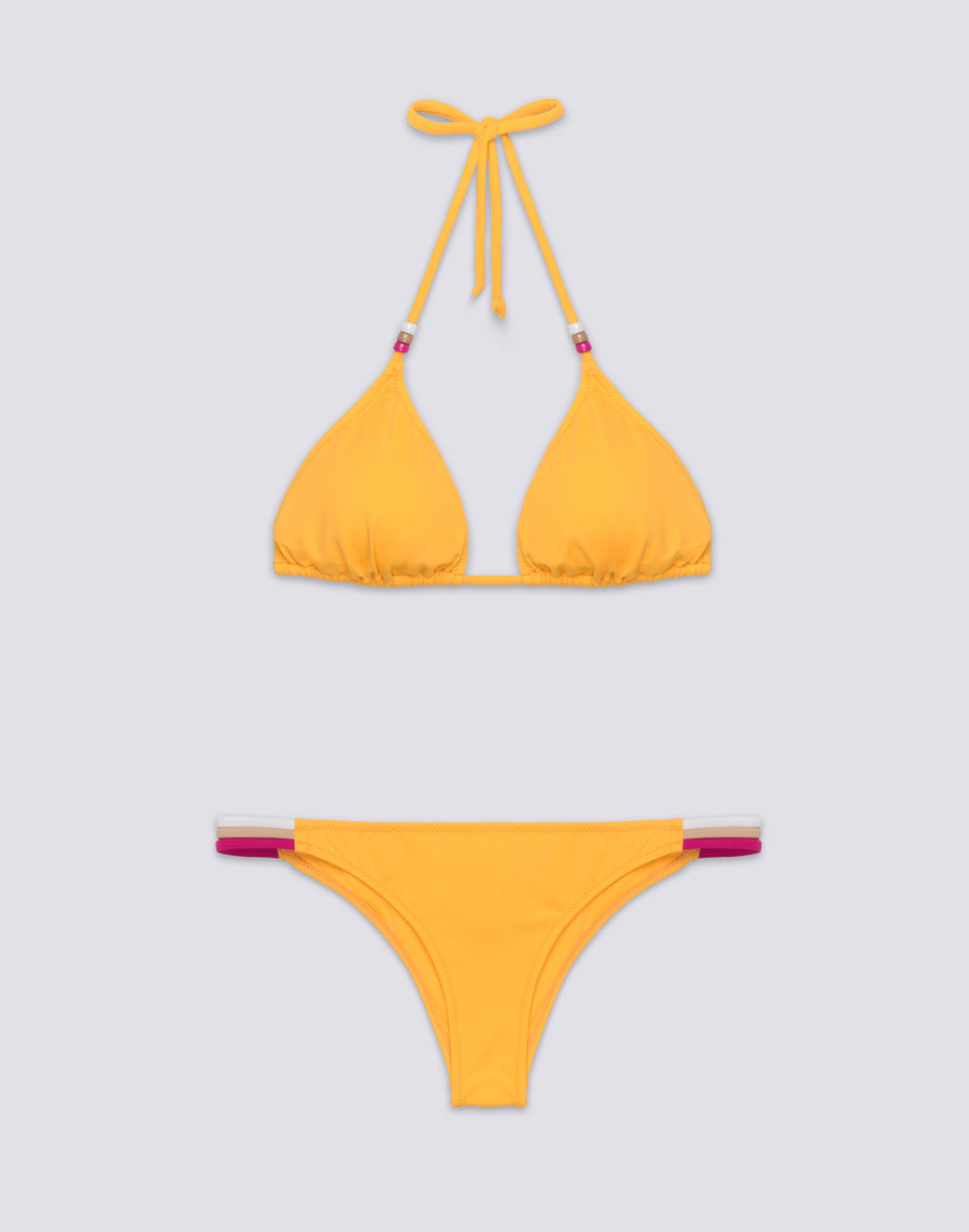 Haz sitio en tu maleta para este traje de bikini confeccionado con tejido ecológico. El triángulo tiene forma de vela, acolchado, con abalorios extraíbles en los lazos. La parte inferior del bikini se fija con un detalle de banda tricolor estilo Sundek en el lateral.