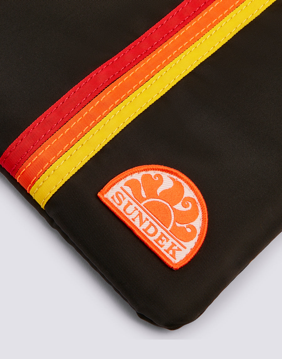 Pochette de plage légère et doublée avec le détail emblématique des rubans tricolores pour ranger et protéger les objets essentiels que tu choisis d'avoir à portée de main. Idéale pour emporter dans ton sac ou toute seule grâce à sa dragonne pratique.