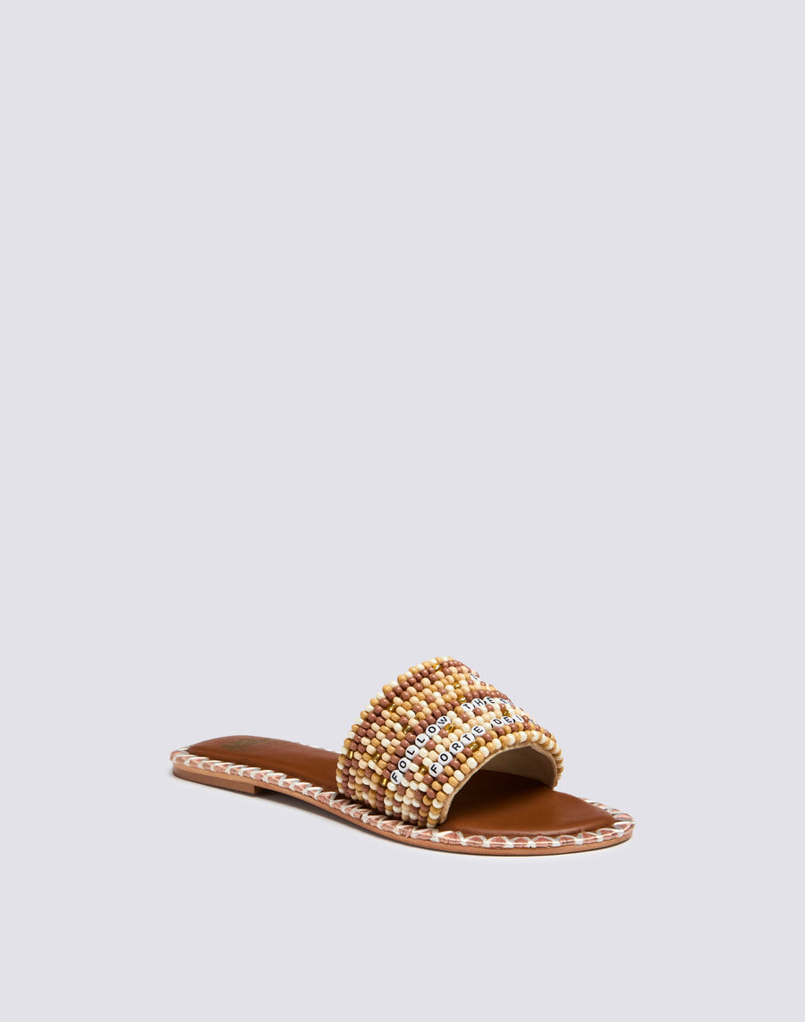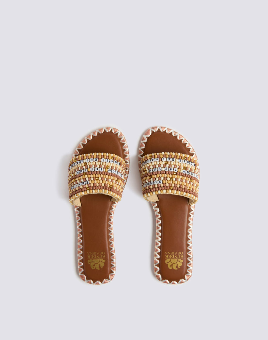 SEMELLE EXTÉRIEURE 100% CUIR DE BUFFLE SEMELLE INTÉRIEURE 100% CUIR DE MOUTON 100% PERLES DE VERRE CUBES EN PLASTIQUE RAPHIA 100% NATUREL