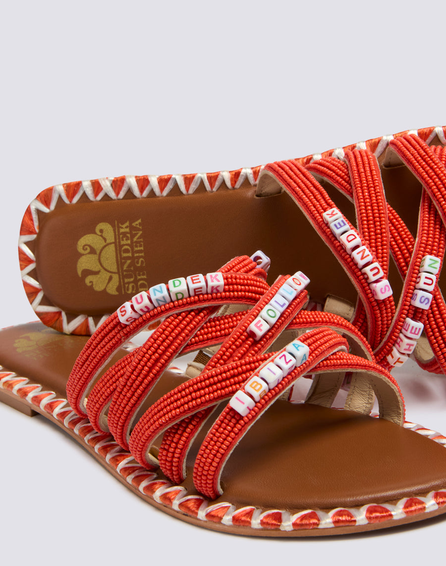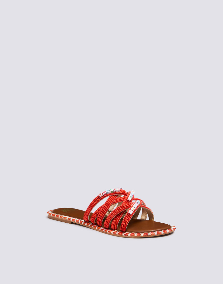 SEMELLE EXTÉRIEURE 100% CUIR DE BUFFLE SEMELLE INTÉRIEURE 100% CUIR DE MOUTON 100% PERLES DE VERRE CUBES EN PLASTIQUE RAPHIA 100% NATUREL