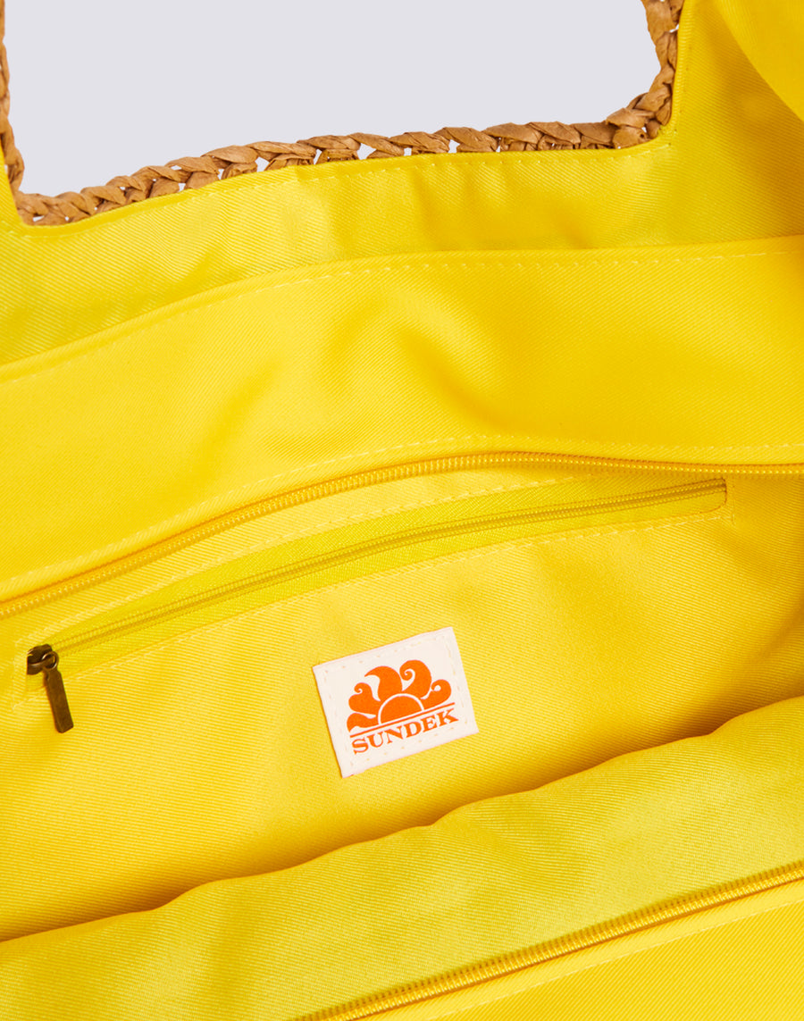 Sac shopping en papier effet paille avec poignées contrastées. Spacieux, équipé d'une fermeture zippée centrale, il est idéal pour une promenade ou comme sac de plage.