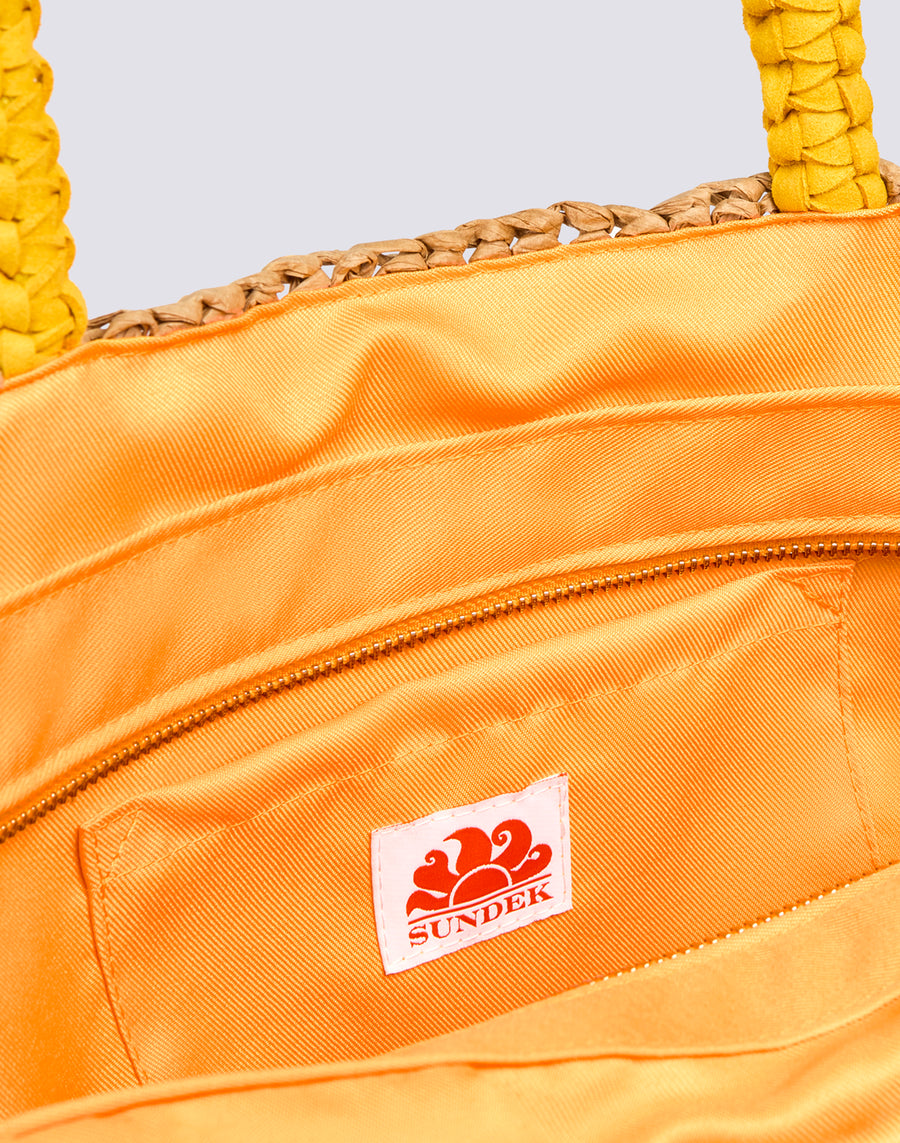Sac shopping en papier paille avec slogan FOLLOW THE SUN en éponge, décoration sur la poignée et fermeture zippée. Un modèle différent, original, adapté à différents types de looks.