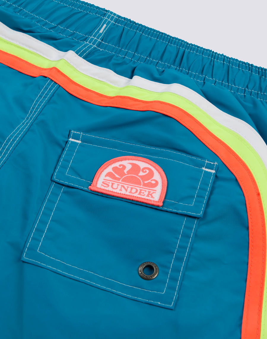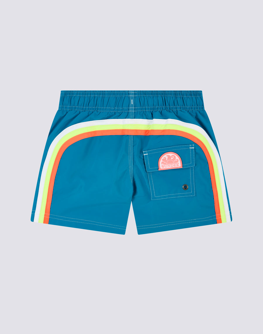 Couleur intense et matière hyper confortable à séchage rapide pour ce short de bain garçon. Un modèle qui accompagnera votre enfant dans ses mille activités de vacances, parfait pour bouger et jouer en toute liberté. il est fabriqué à partir de notre tissu en taffetas de nylon héritage et construit avec des coutures à trois aiguilles qui le rendent durable dans le temps. À ranger dans sa valise, année après année.