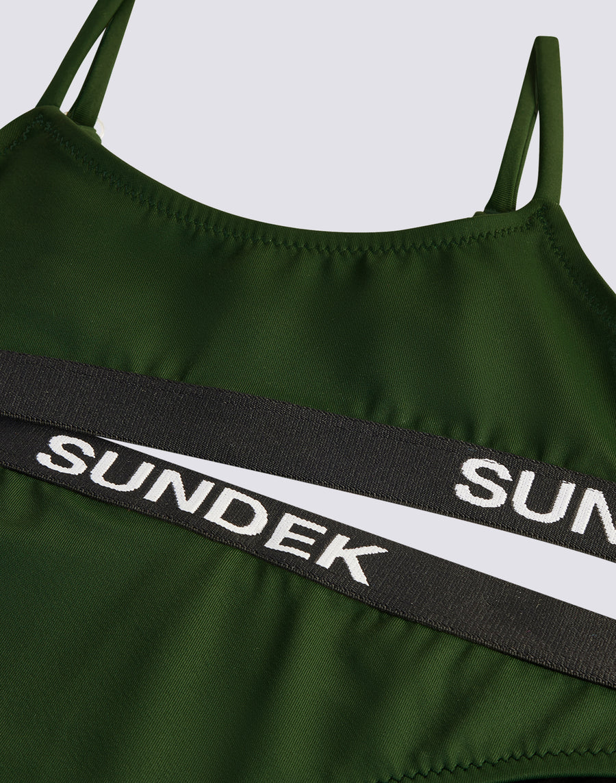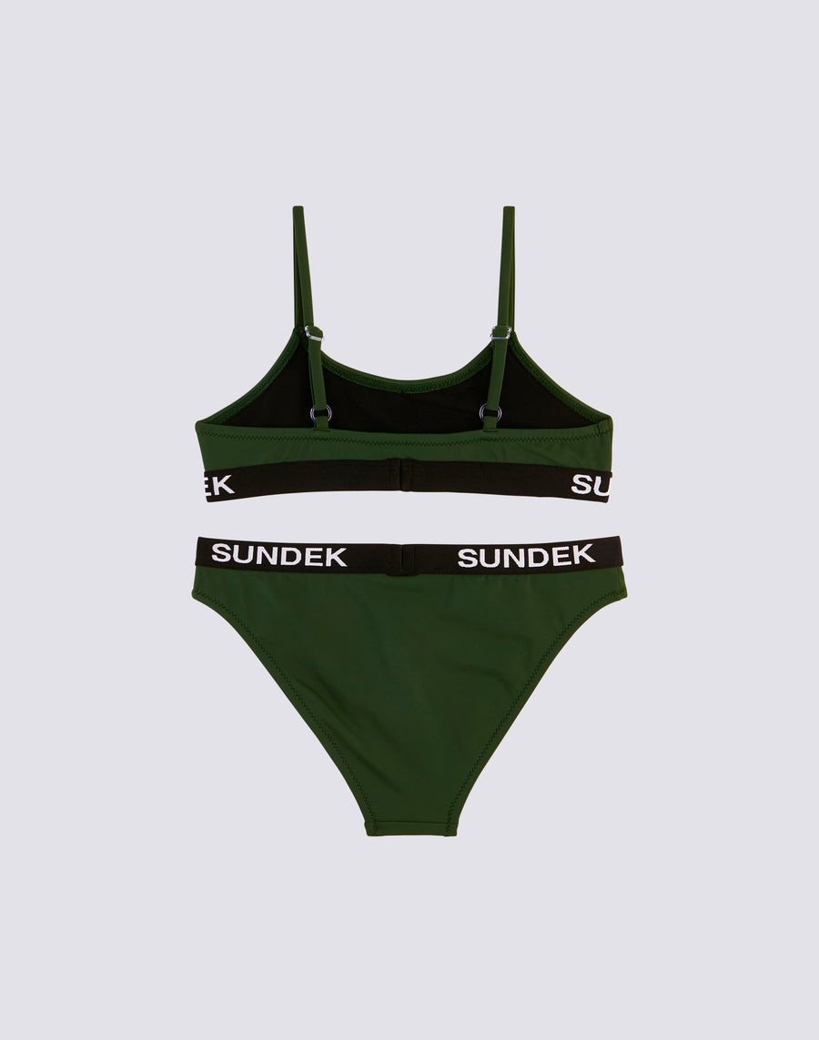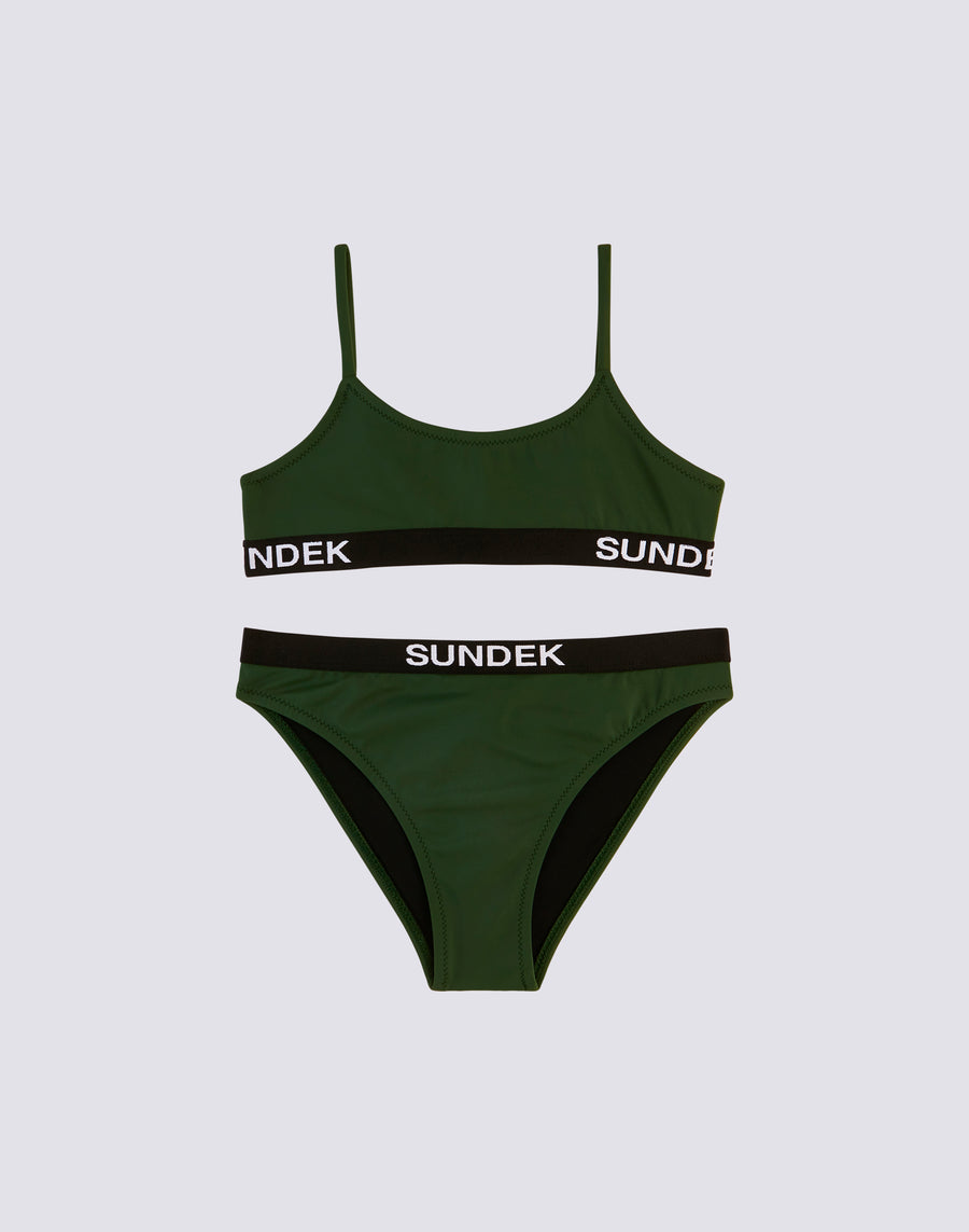 Pour ta petite fille, opte pour ce bikini composé d'un haut en bandeau et d'un slip avec élastique, les deux pièces sont personnalisées par le logo contrasté. Doux et résistant, le tissu écodurable convient à une infinité de bains et de jeux sur la plage.