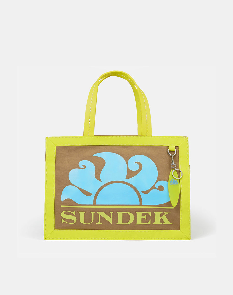 Sac à main moyen en toile avec logo Sundek imprimé. Charm avec la forme caractéristique d'une planche de surf