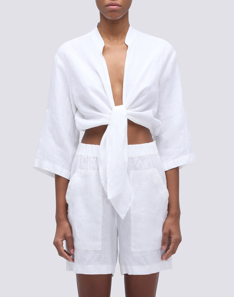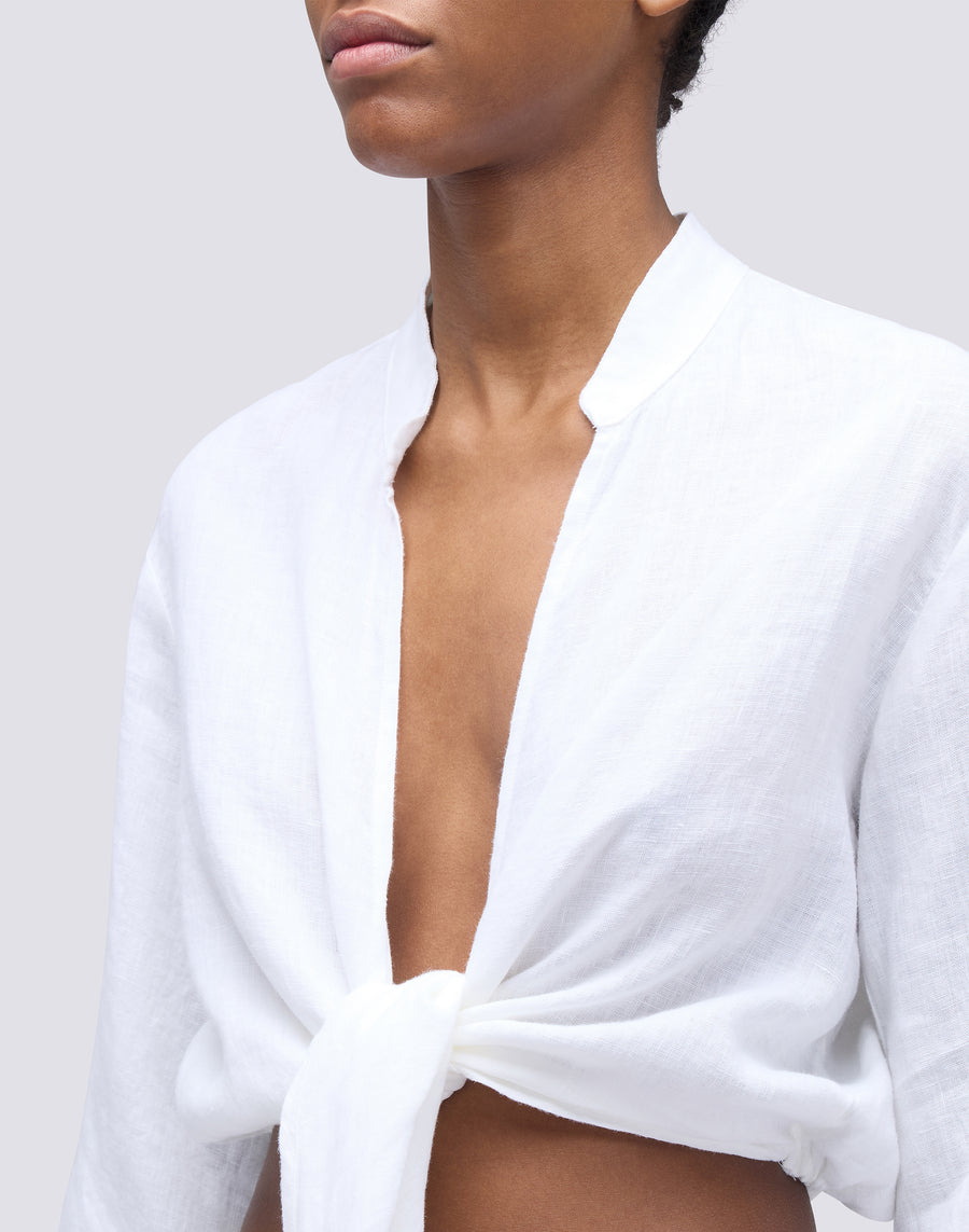 Chemise en lin teint dans la masse avec coupe courte et fermeture à nœud, manches froncées et col mandarin. Fraîche et audacieuse, pour des looks informels et décontractés.