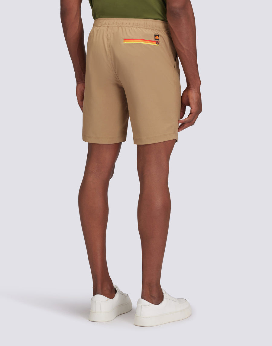 66% POLYAMIDE 29% POLYESTER 5% ELASTANE – QUICK DRY Lightweight, quick-drying, water-repellent, stretchy and super comfortable nylon-polyester blend fabric. Thanks to its technical features, it is suitable for use both in and out of the water.