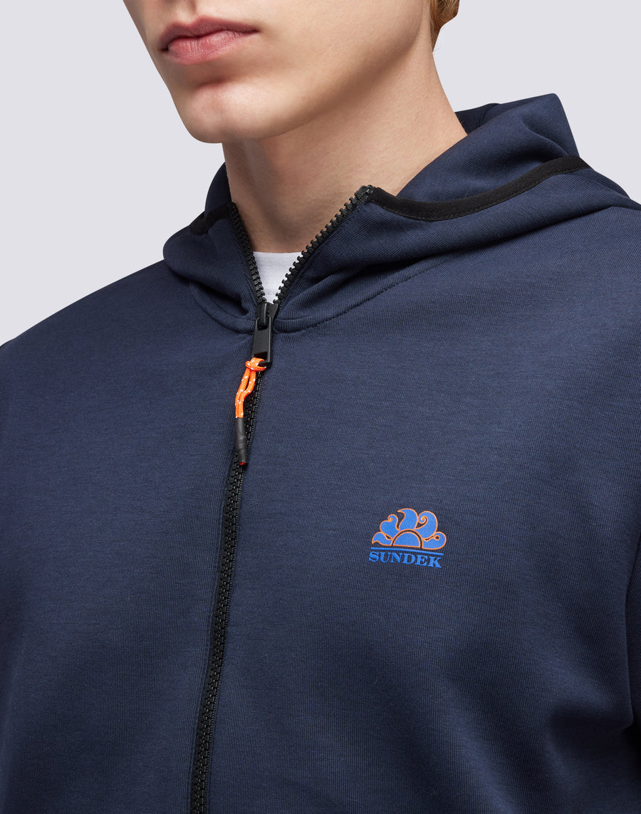 Sweat homme entièrement zippé avec capuche en coton Interlock. Idéal lors des fraîches journées d’automne ou de printemps. Parfait pour donner vie à des tenues décontractées ou plus techniques. Coupe régulière.