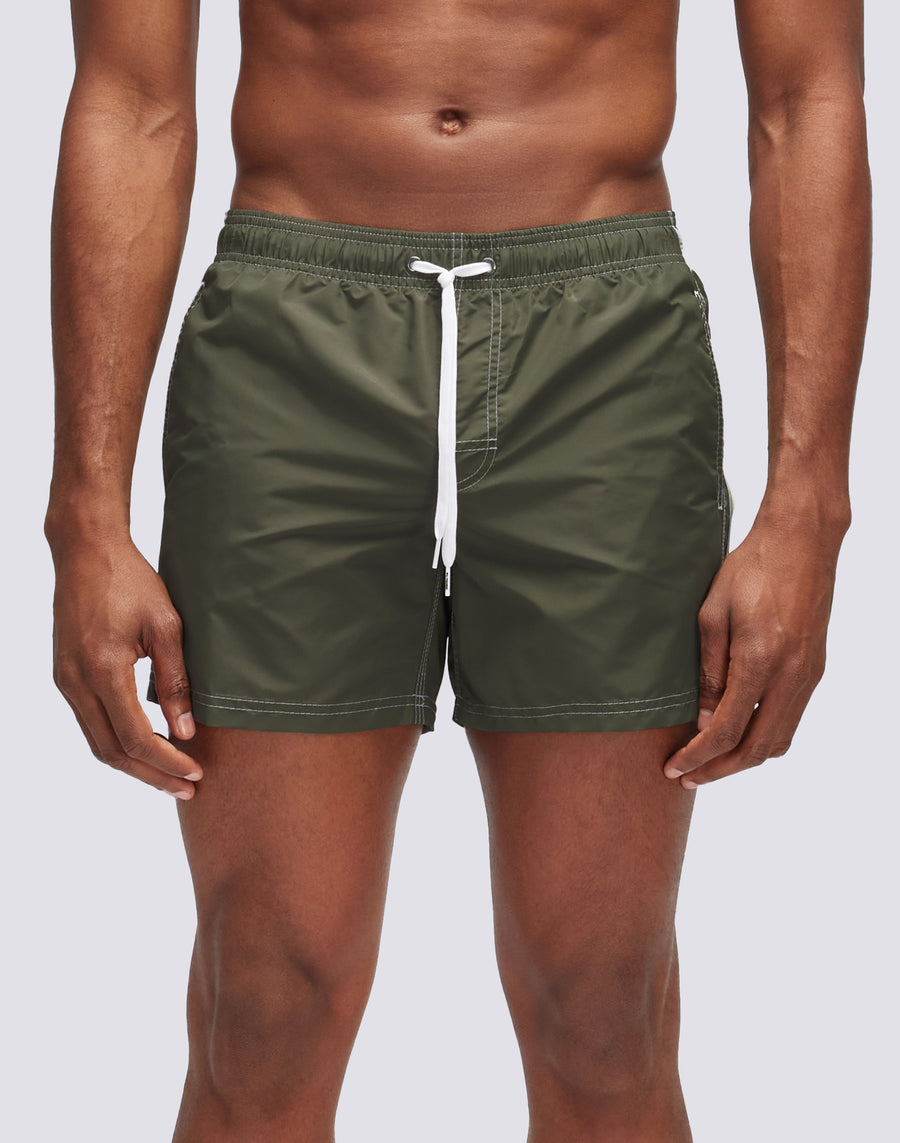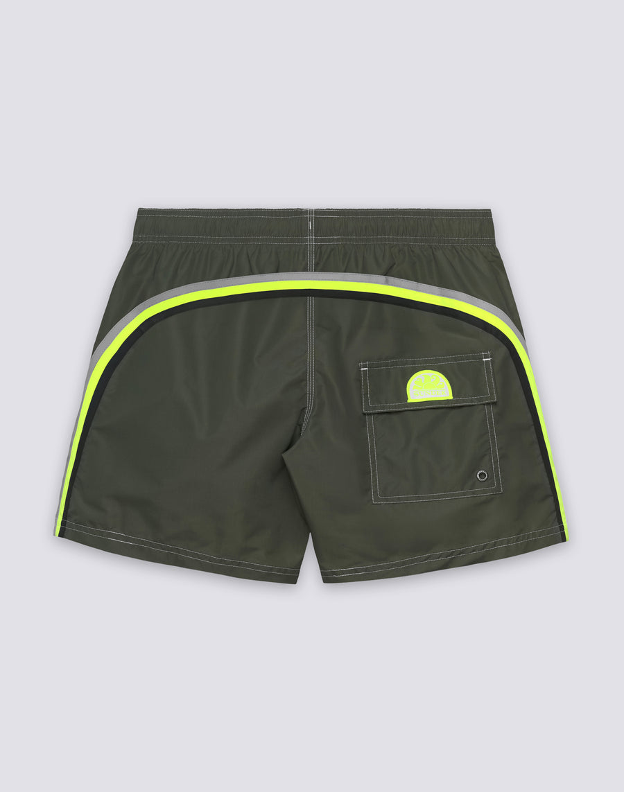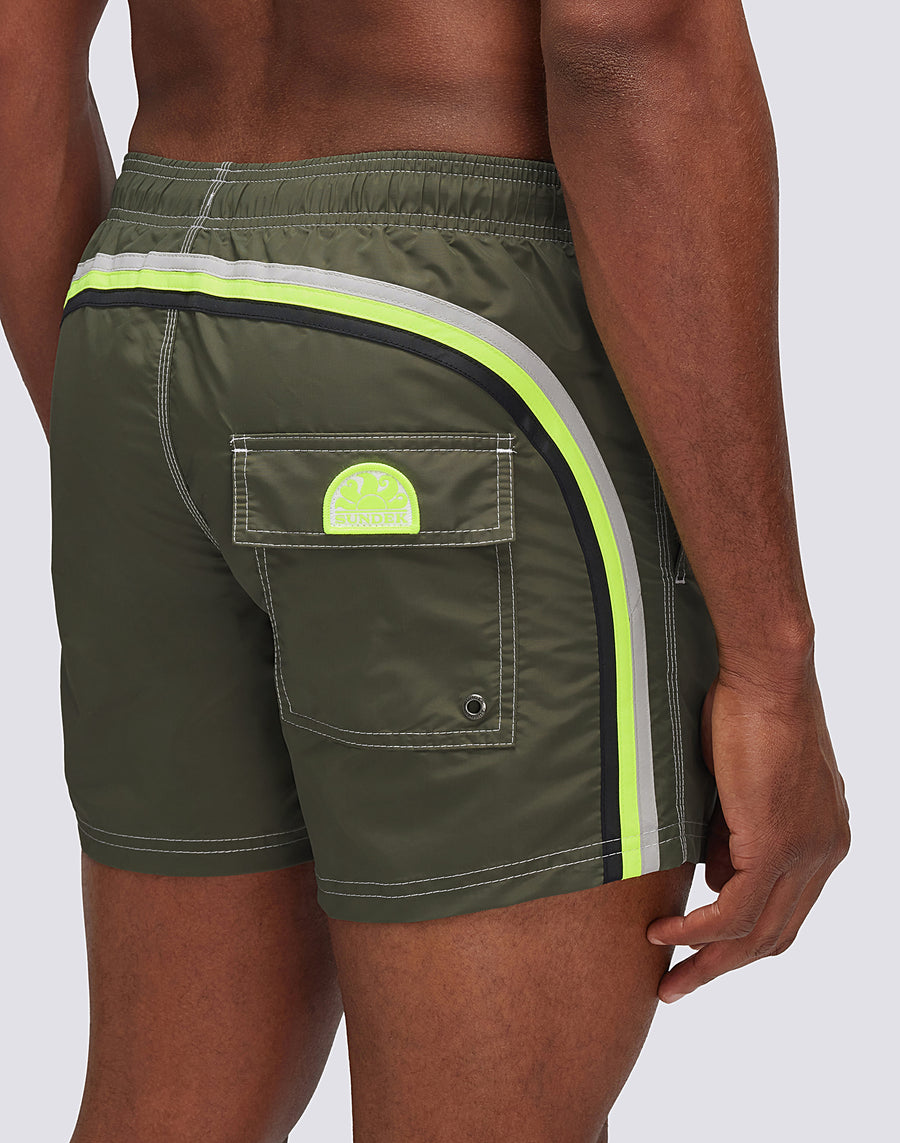Short de bain pour homme avec une taille élastique, un cordon de serrage et l'arc-en-ciel emblématique de Sundek dans le dos. Ce maillot de bain est réalisé avec des coutures à trois aiguilles et 100% avec notre tissu historique, le nylon-taffetas : soyeux, léger et résistant à tout, il sèche rapidement pour vous apporter du confort partout, dans les vagues et hors de l'eau. Longueur 35 cm (taille M), mesurée à l'extérieur de la jambe.