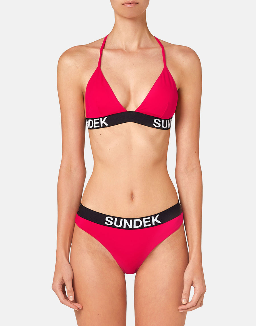 Top triangulaire ajustable alliant féminité et sportivité, pour un look beachwear dynamique mis en valeur par la bande élastique avec logo contrasté. Parfait à tout moment grâce au tissu VITA by Carvico qui accompagne tous les mouvements et ne craint pas le contact avec le chlore, les crèmes et les huiles solaires.