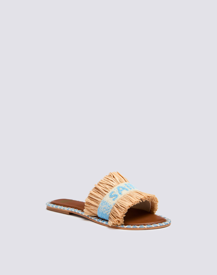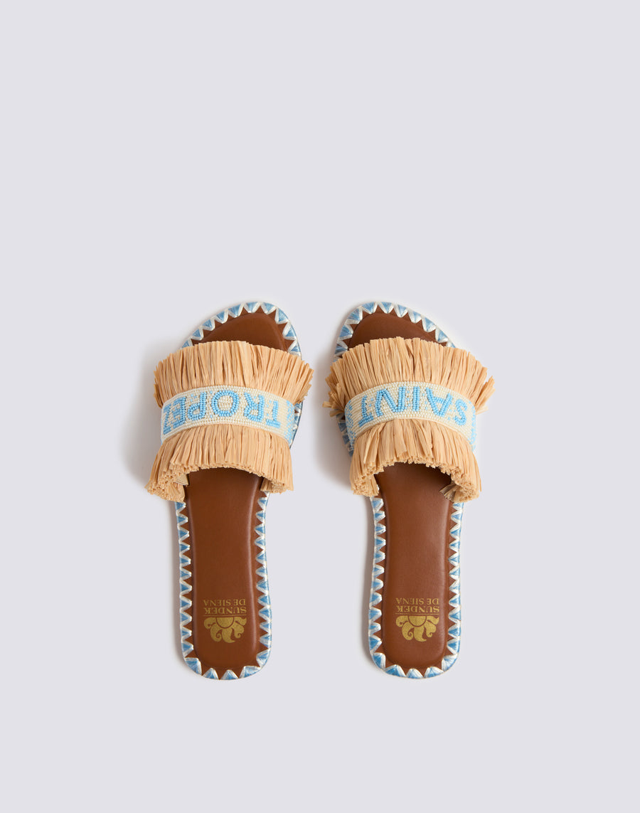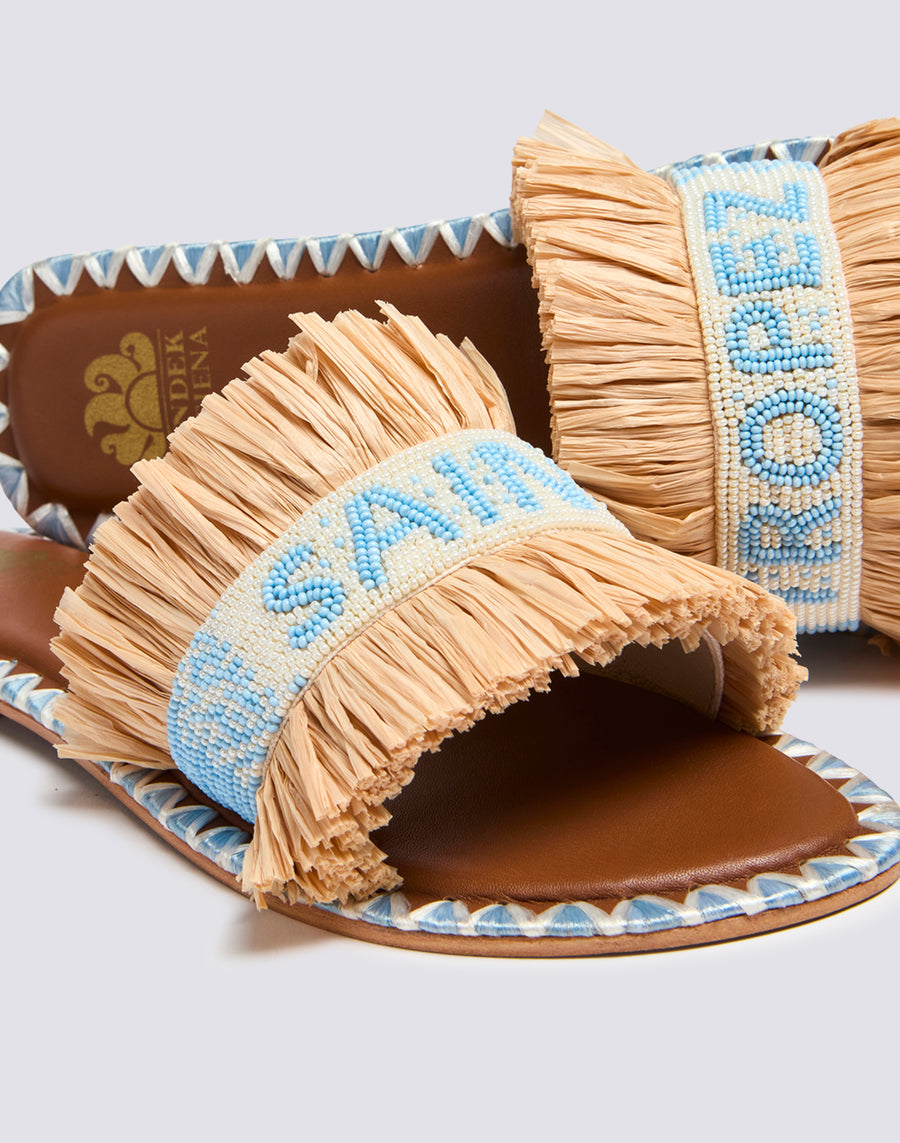 Ciabatta a fascia bassa interamente ricamata di perline in vetro e profilata da frange in raffia naturale. La suola è in vera pelle, anch'essa profilata da un ricamo artigianale in raffia.