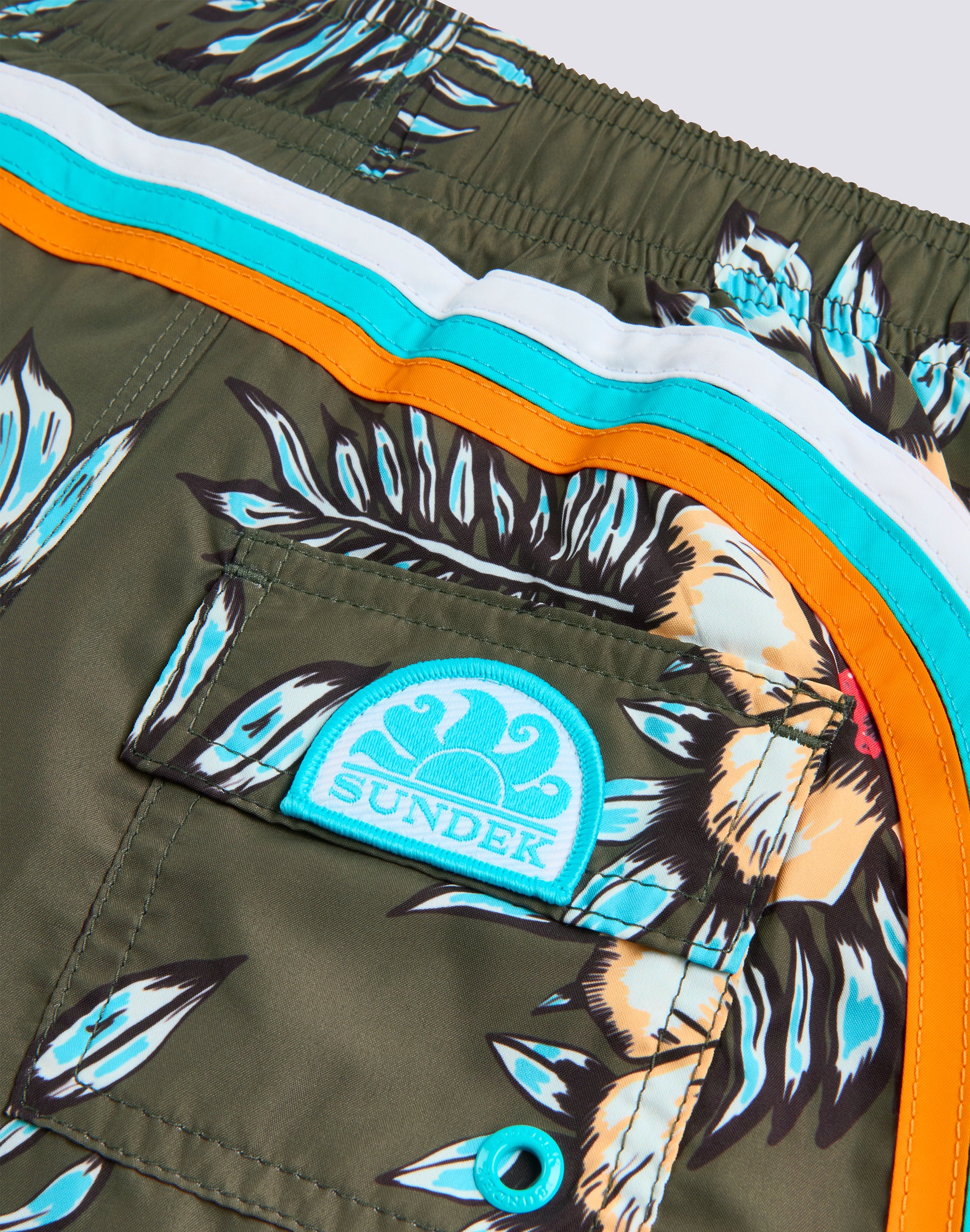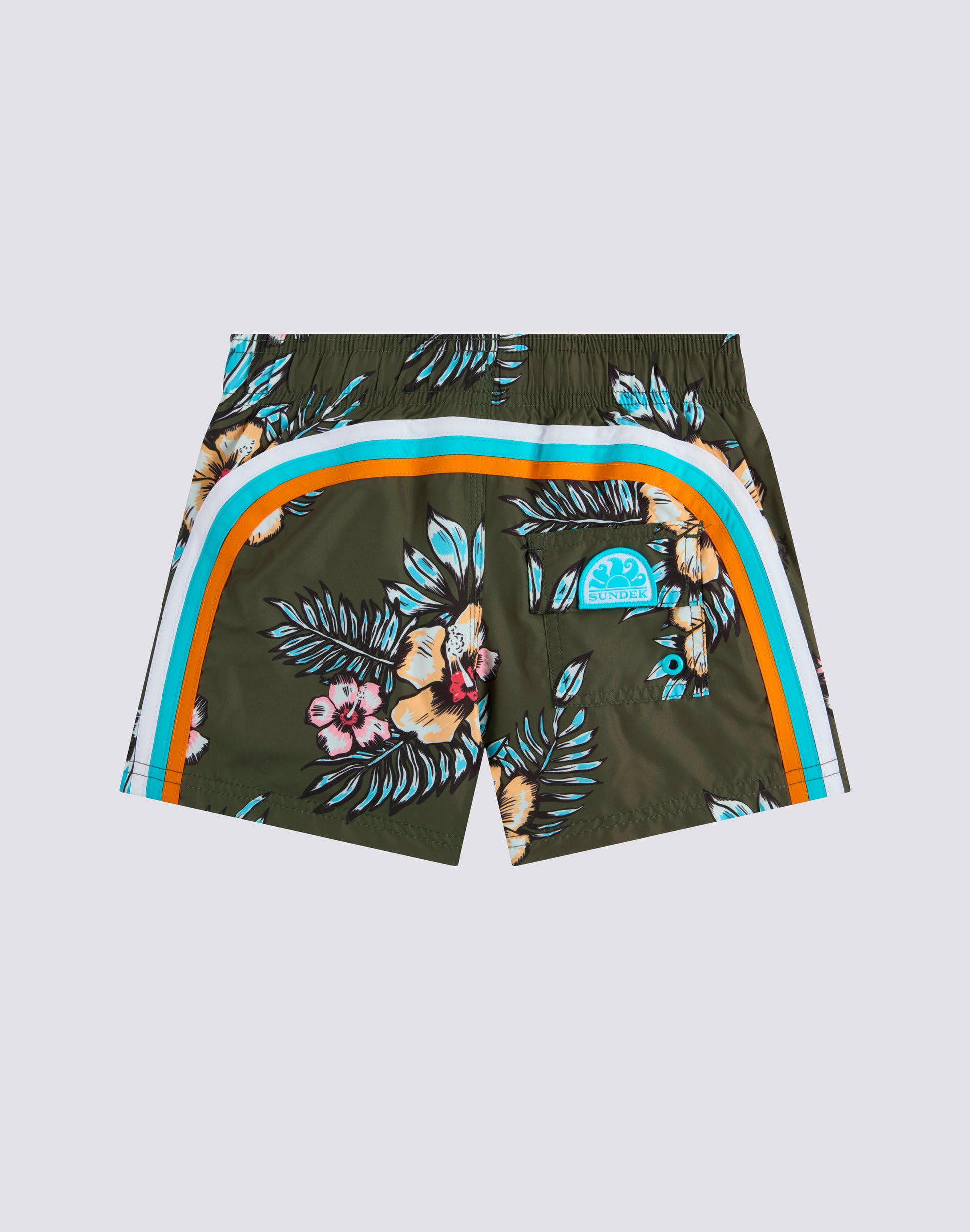 Costume da bagno con coulisse elastica in vita, in leggero tessuto Repreve® riciclato da bottiglie di plastica. Con stampa Graphic Flower e il tradizionale arcobaleno Sundek sul back. Lunghezza esterno coscia 10.25"/26 cm (in taglia 6 anni).