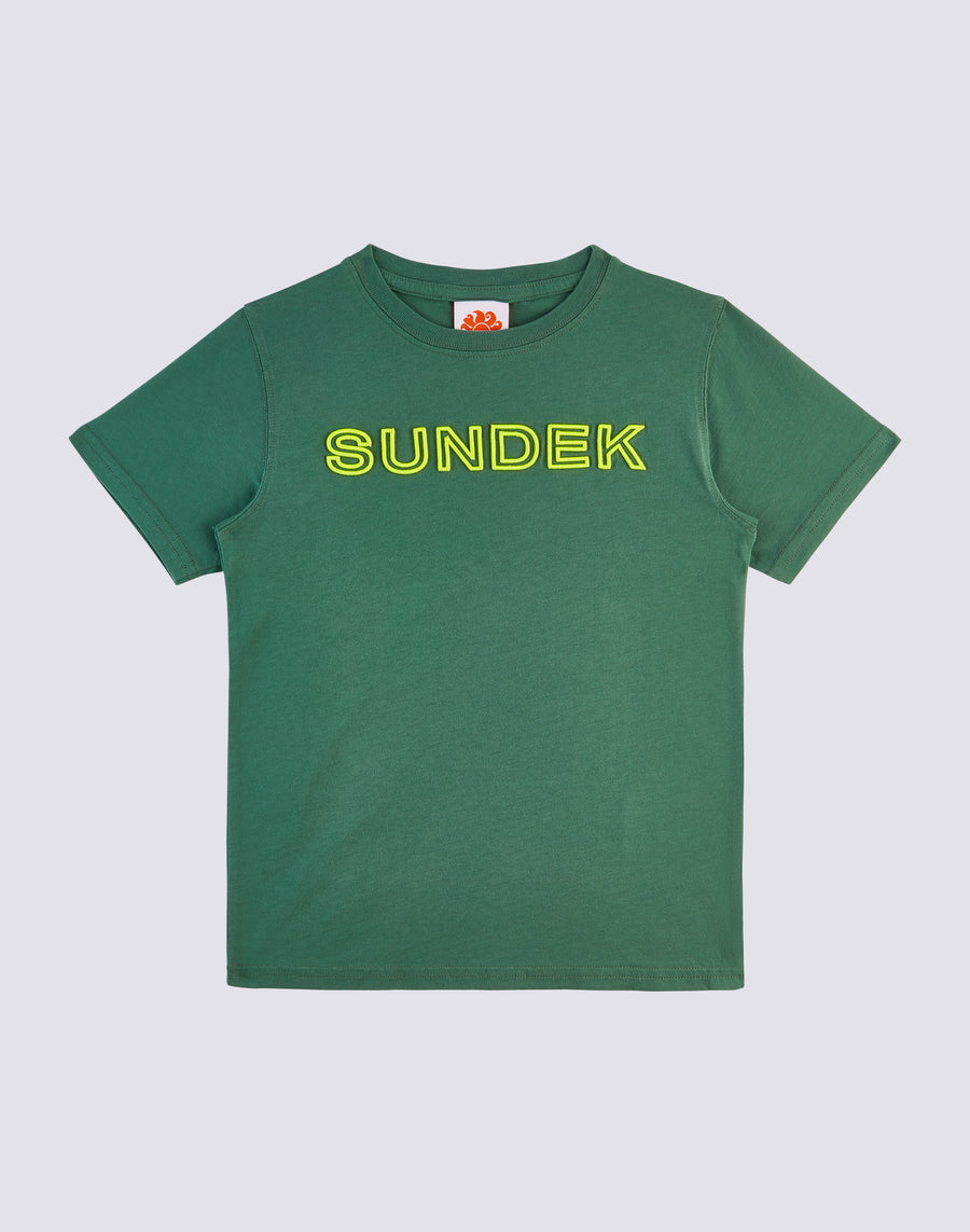 Questa maglietta di cotone a manica corta presenta un logo ricamato SUNDEK che la rende unica. Perfetta per i bambini, è leggera e resistente, ideale per qualsiasi attività all'aperto.