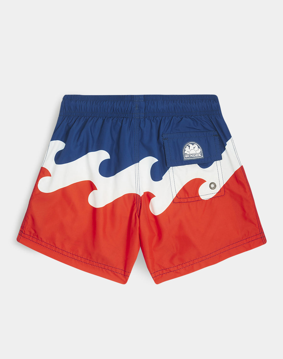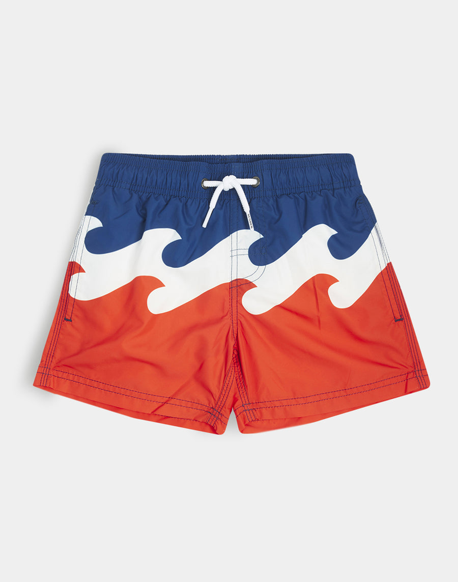 Colori intensi e tessuto iper-confortevole in poliestere riciclato per questi pantaloncini mare bimbo. Un modello che accompagnerà il bambino nelle sue mille attività in vacanza, perfetto per muoversi e giocare in piena libertà. Realizzato con una colorata stampa multionde, è da mettere in valigia, anno dopo anno.