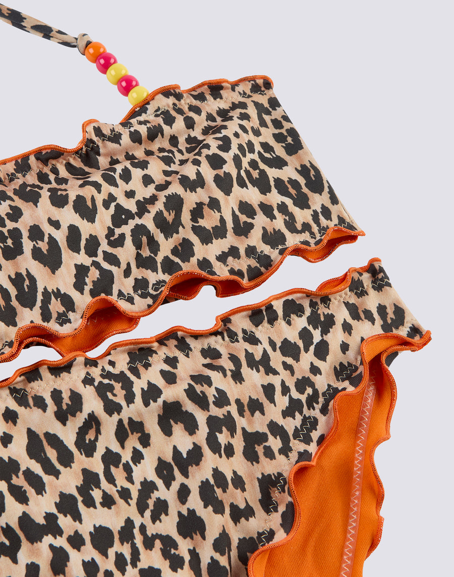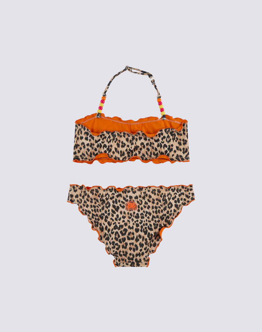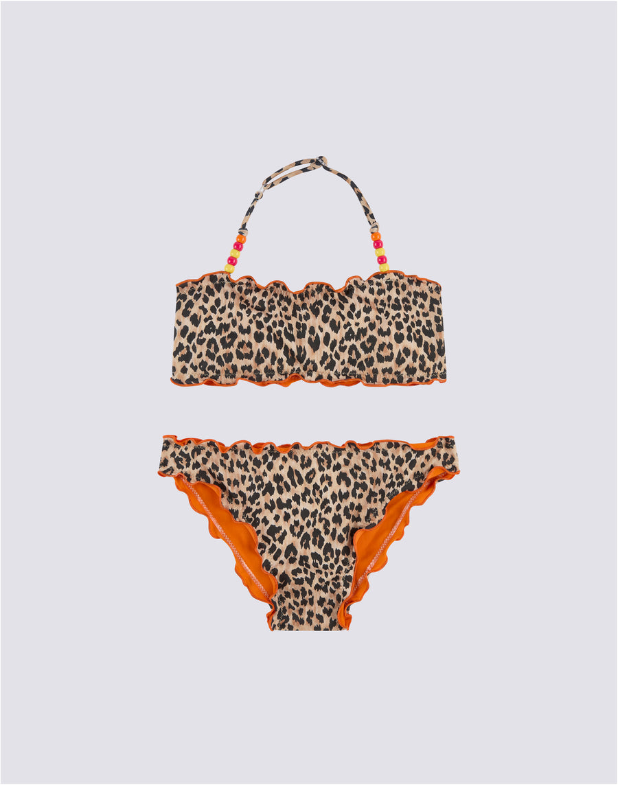 Mini bikini da bambina in stampa Sweet Leopard formato da slip arricciato a vita fissa e top a fascia, sempre arricciato, con perline multicolor.