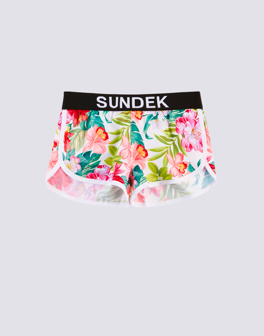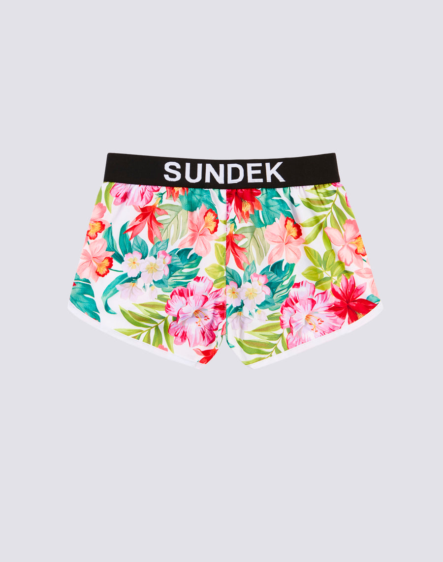 Mini Lulin pantaloncino mare corto con vivace stampa Bora Bora di ispirazione hawaiana, elastico logo in jacquard brandizzato e rifiniture in contrasto. Ideali da abbinare al costume a due pezzi in coordinato.