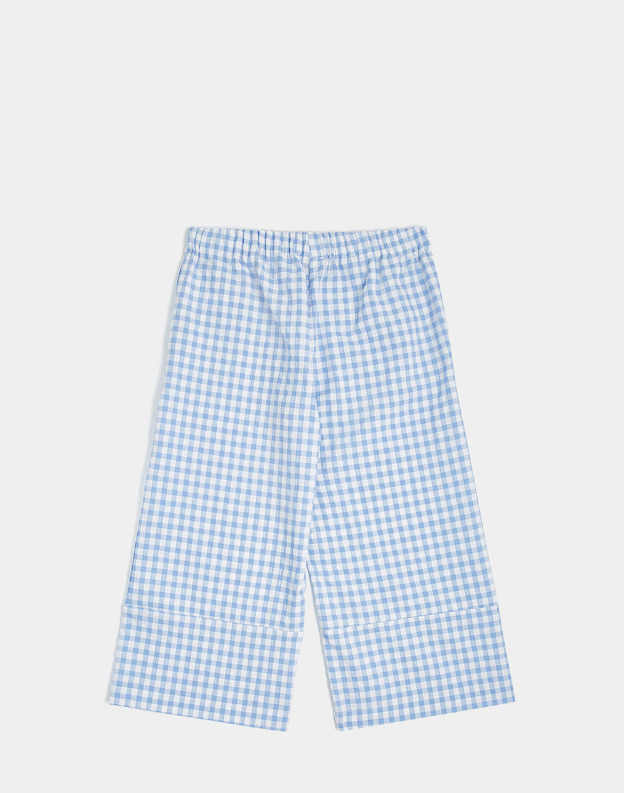 Graziosi pantaloni lunghi da bambina in cotone vichy, modello palazzo con vita semi elasticizzata. Ideali per occasioni più eleganti, da abbinare a una camicetta o una maglia.